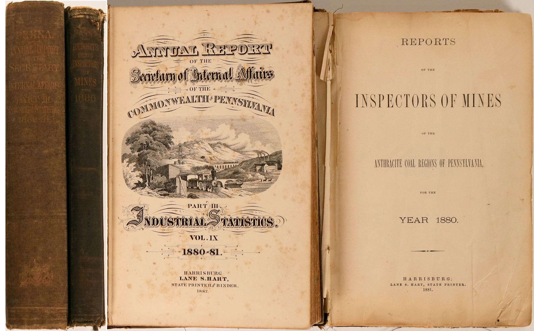 Hardcovers. Reports of the Inspector of Mines, 1880, tape repaired map of PA anthracite coal areas. 247pp with fold out maps, fair condition. Annual Report of the Secretary of Internal Affairs 1880-1881, 642pp with index. boards detaching