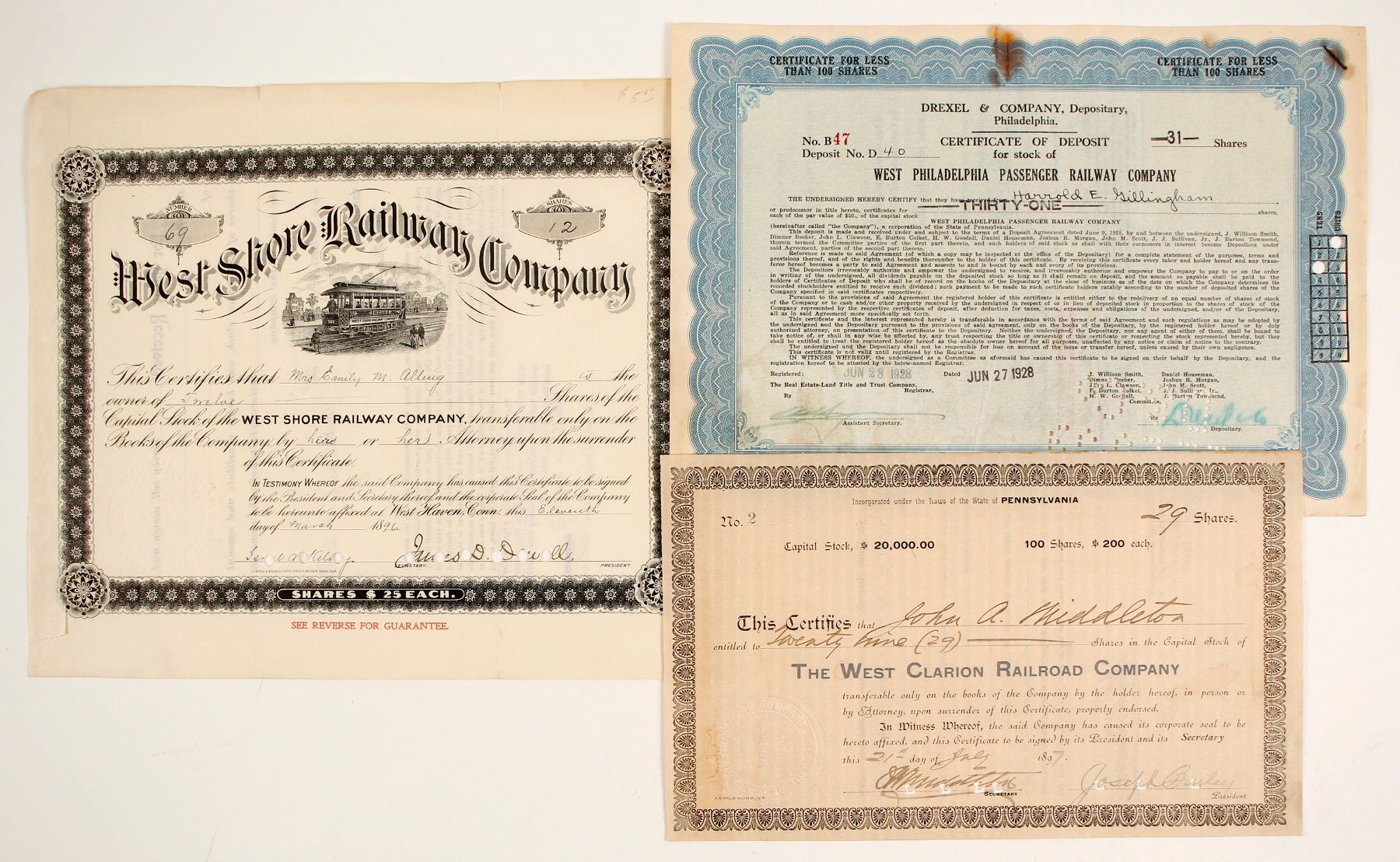 1. The West Clarion Railroad Co. incorp 1897 State of Pennsylvania. I/C #2 for 29 shares @ $200 par, issued July 21, 1897, signed Joseph Bailey president, black, embossed seal, no vignette, printer A.B. King, condition EF 2. West Philadelphia Passenger Railway Co. I/C # 47 for 31 shares @ $50 par, issued Jun 27, 1928, signed (Illegible), blue, no vignette, printer American Bank Note Co. small stains, no tears.