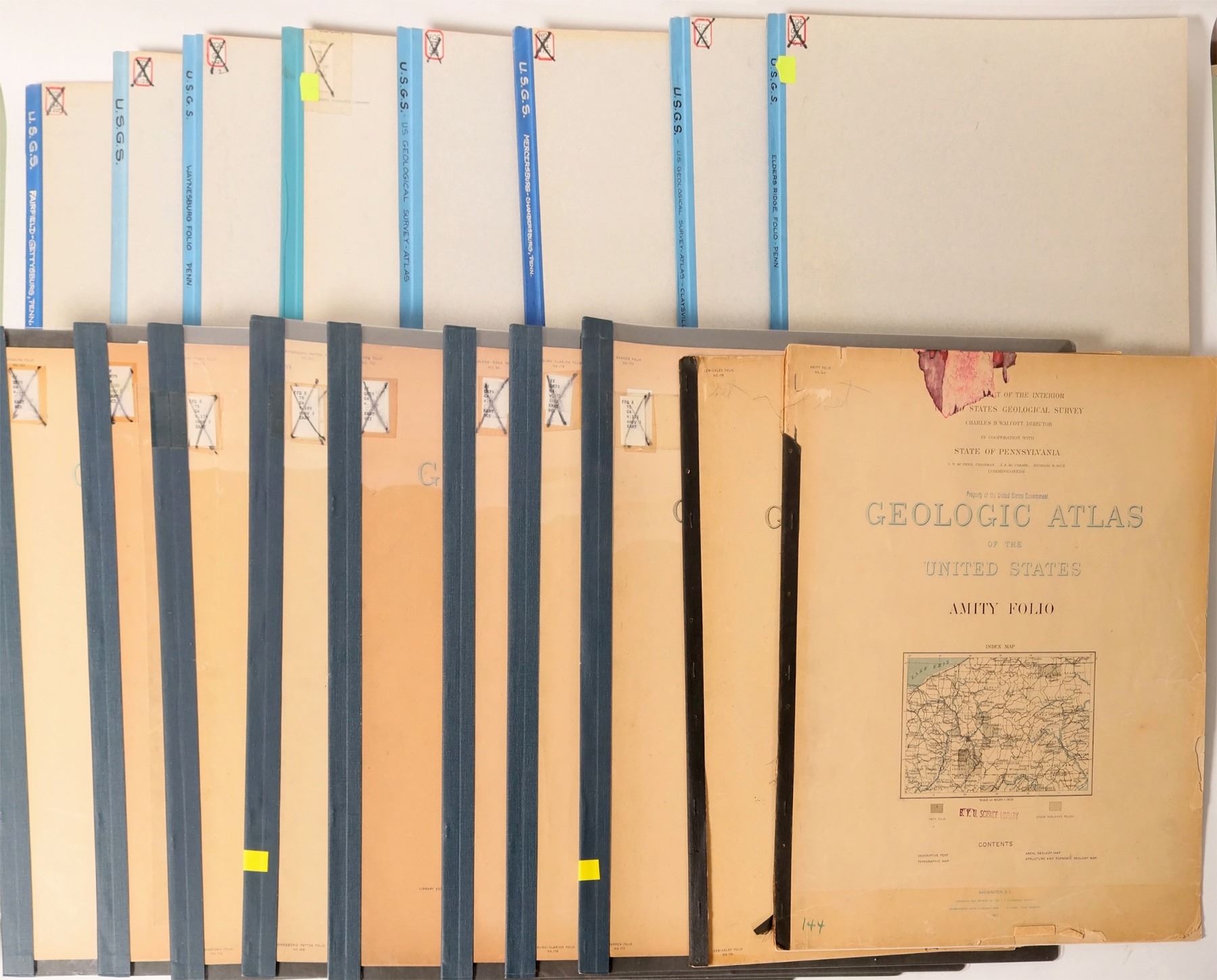 Group of 18 of the 27 issued folios for Pennsylvania, including edge folios. Dates from c1902-c1930. Includes:Accident 1908; Amity 1907; Barnesboto 1913; Claysville 1912; Ebensburg 1905; Eldersridge 1905; Elkland 1903; Fairfiled 1929; Foxburg 1911; Gaines 1903; Indiana 1904; Johnstown 1910; Latrobe 1904; Mercersburg 1909; Rural 1905; Sewickley 1911; Warren 1910; Waynesburg 1905. Most of these folios were made in the first decade of the USGS folio project. This group is mostly bound in library protective bindings.