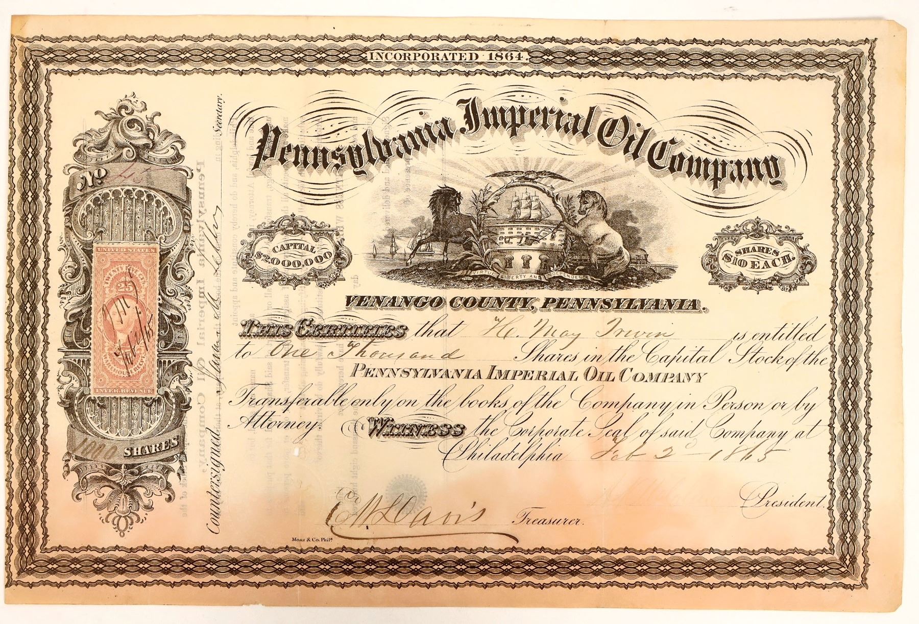 A stock certificate for 1000 shares in the Pennsylvania Imperial Oil Company, made out to Ms. May Irwin and dated 1865. No. 45 issued. The certificate is signed by the treasurer and president of the company, and bears an embossed company seal. It also has a 25¢ IR stamp affixed in an ornate stamp frame and an engraved vignette featuring the Pennsylvania state seal. The certificate is in very good condition, with some creasing from storage and toning consistent with age.