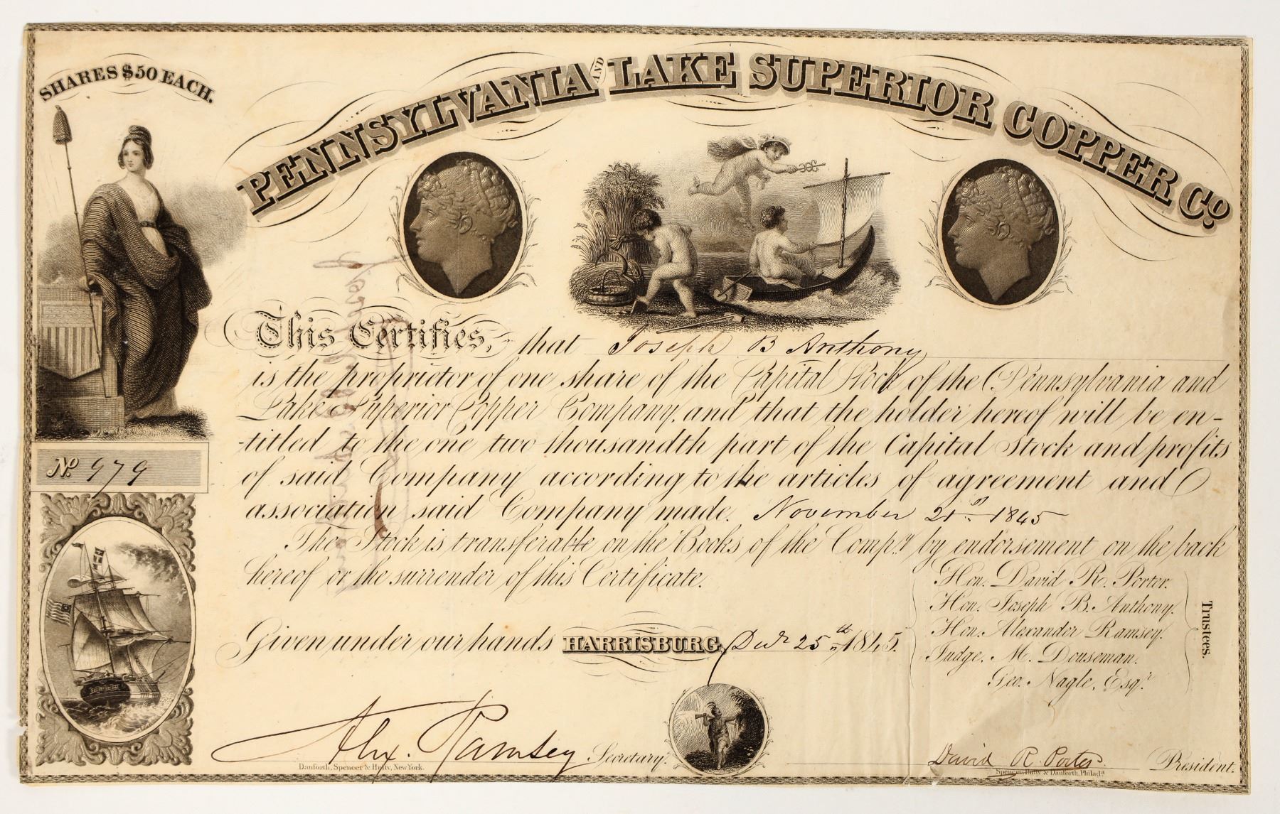 No. 979, issued to Joseph B. Athony for one share in Harrisburg in 1845. Signed by president David R. Porter and secretary Alexander Ramsey. Not cancelled. Multiple allegorical vignettes. 6 x 10" Pinholes, clean. De Good, pg. 291, R-6, less than 10 known. Leased #41 of Richard Adams, S.E. of Eagle River. No production information known.