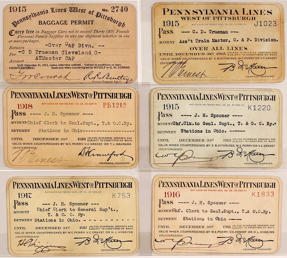 Lot of 6. Issued: two 1915 passes and one 1915 baggage permit; 1916; 1917; and 1918. Overall very good condition. Reverses list the various systems the pass is good on. (Potter Collection) HWAC# 59951 Date: Location: Pennsylvania