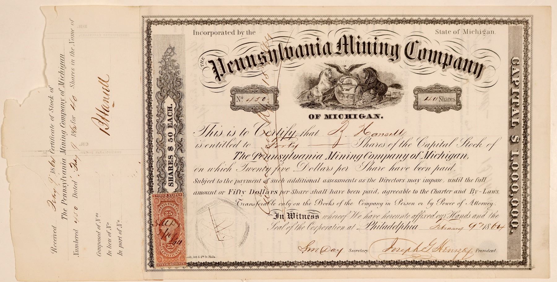Inc. in Michigan. No. 450, issued in 40 shares to Hansell on Feb. 17th, 1864. Signed by president Joseph Henzey and secretary S. Day. Pen cancelled. Black border and print, allegorical vignette. One 25 cent adhesive stamp at bottom left. 7 x 10.5" Stub attached. Damage mostly to stub. Folds. An underground copper mine consisting of three shafts located near Delaware. The Pennsylvania Mining Company was organized in 1861 after splitting off from the Northwest Mining Company. The company began work on the Pennsylvania Fissure which consisted of three separate veins crossing their property. Shafts were sunk on each vein after rich copper deposits were discovered. The mine had a relatively short life, partly because company management spent their entire capital on surface improvements instead of mining, and the mine closed in 1866. [Ref:mindat.org] Houghton Estate Collection