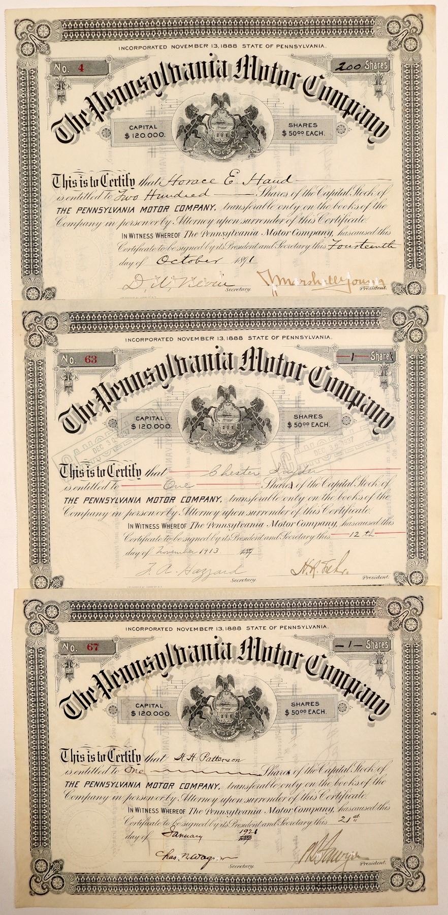 Lot of three. 1) Best is Low Number 4, issued in 1891 to Horace E. Haud for 200 shares. Signed by president J. Marshall Young and the secretary punch cancelled. Black border and print, Pennsylvania state seal vignette. 2) The other two are the same design as the previous. Issued in 1913 and 1921. Both have different corporate signatures, one punch cancelled and the other stamp cancelled. 7.75 x 10" This was a PA railroad that operated from the 4th Street station of the New Jersey Central Railroad to Northampton to Parker Ave. terminus. Ken Prag Collection