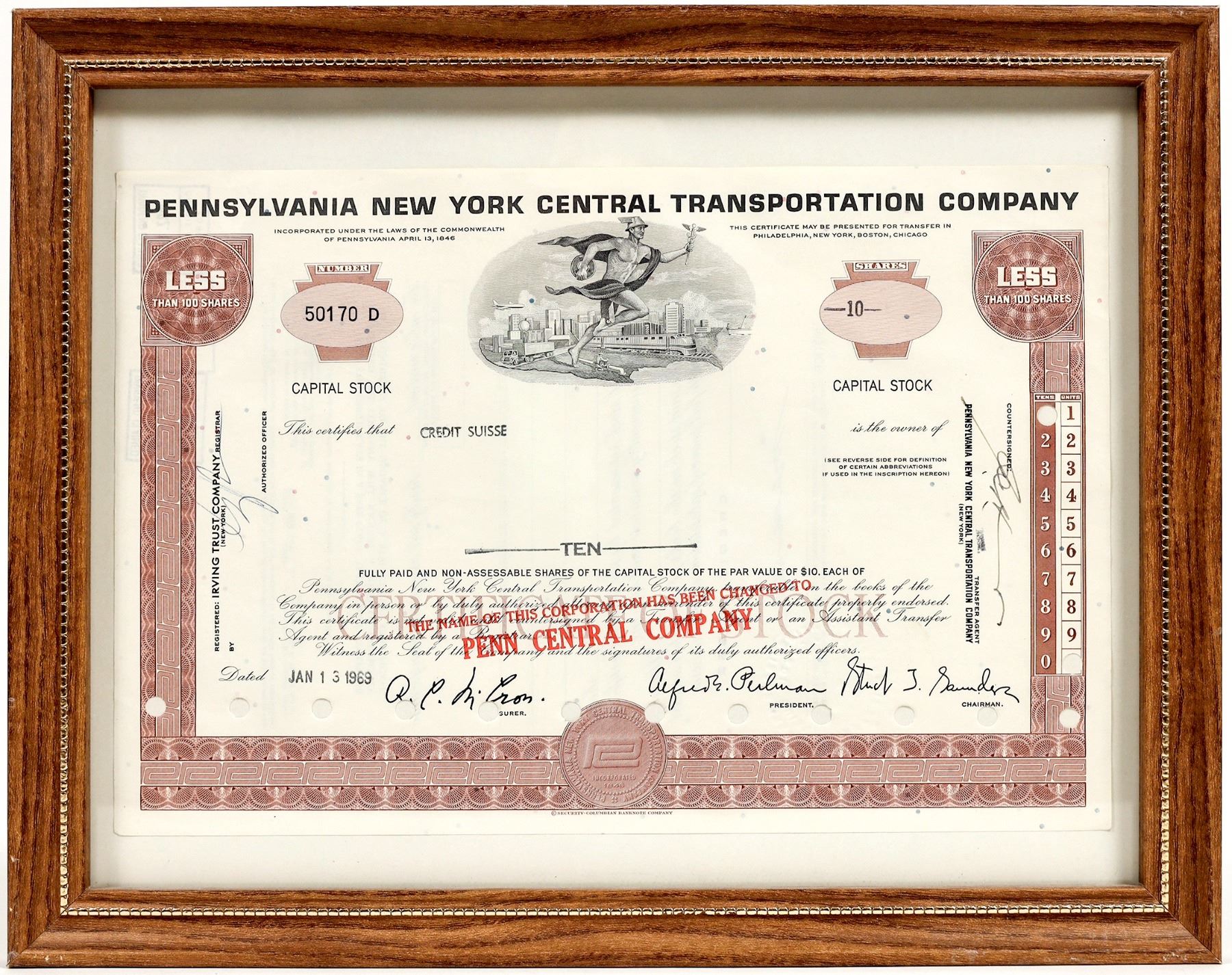 This stock certificate was issued in January, 1969 to Credit Suisse for ten shares. Later called Penn Central Company stamped on the front. Credit Suisse was acquired by UBS in 2024. A beautiful vignette of Mercury surrounded by industry. The certificate is colored with dots to prevent counterfeiting. Signed by Albert Perlman and Stuart Sanders. 8 in. X 12. now framed.