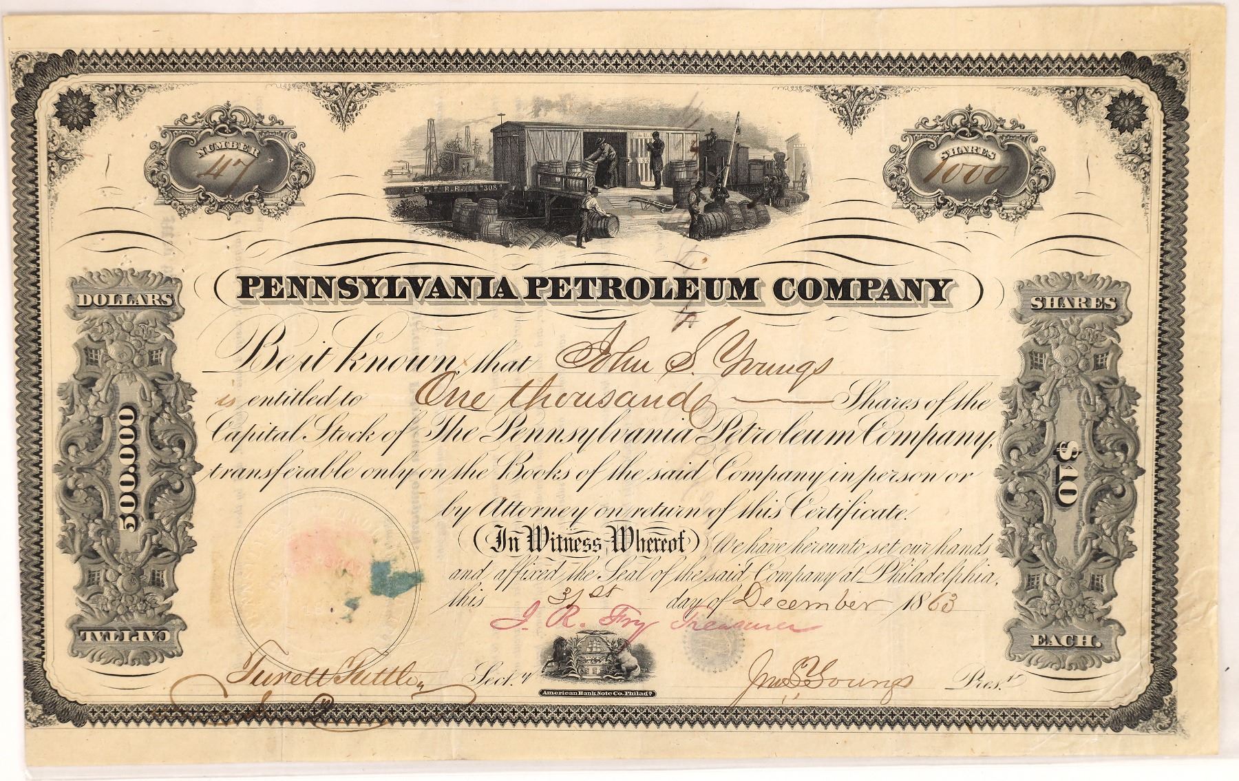 No. 47, issued for 1,000 shares to the company president, John S. Youngs, in Philadelphia in 1863. Signed by Youngs, treasurer JR Fry, and secretary Tuttle. Not cancelled. Vignette of men loading oil barrels onto a train car. Printed by American Bank Note Co., Philadelphia. 6.5 x 10.5" Pinholes, folds, stain. Company owned property along the river at Franklin, Venango County, PA. [Sunbury American, 20 Feb 1864] Venango County Pennsylvania Ken Prag Collection