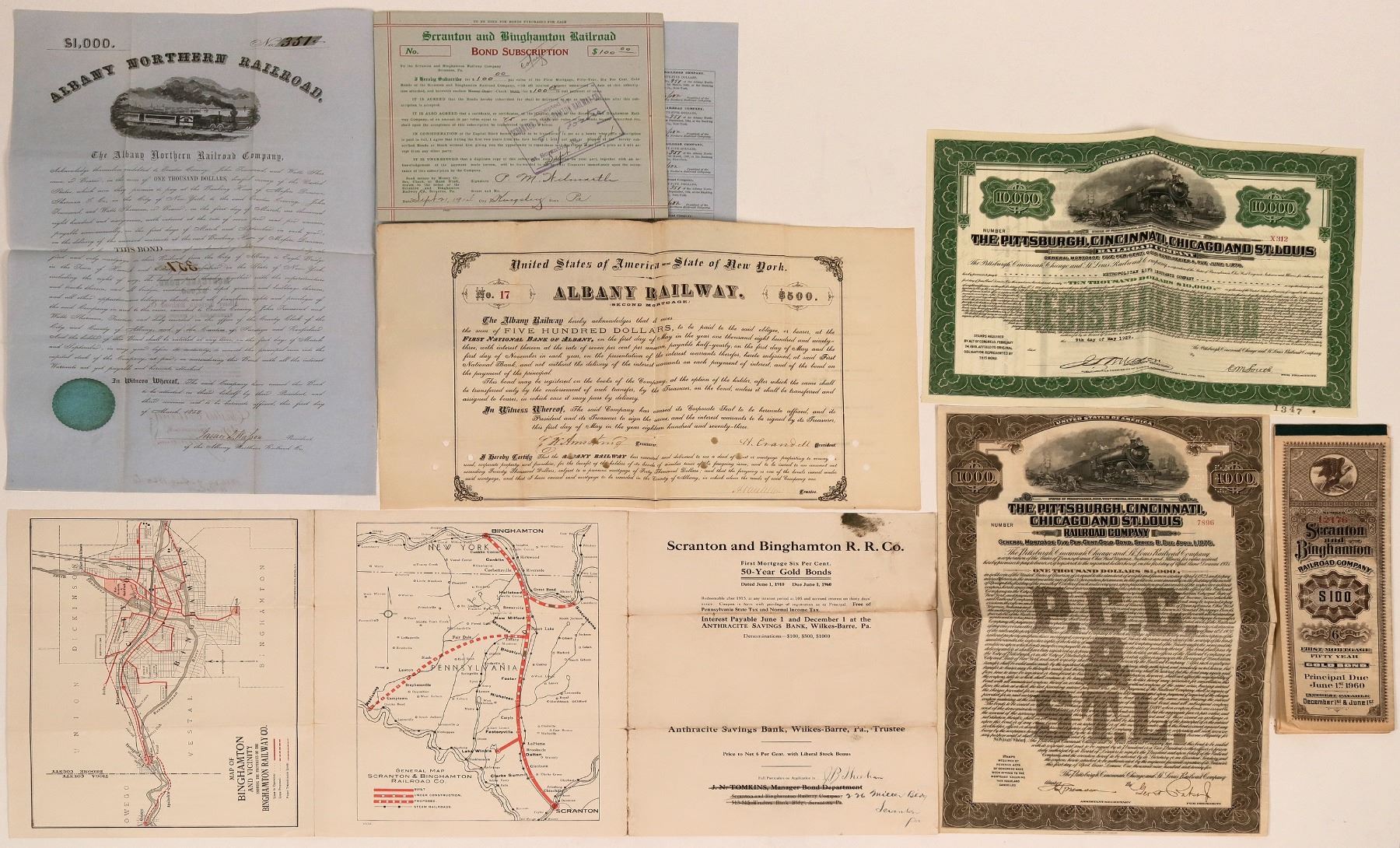 I/C #7896 $1000 5% gold 1925 bond signed by President illegible. I/U #32 $1000 5% gold bond 1929 signed by President South. Incorp. 1910 State of Penn. Bond Subscription, $100 , issued Sept.21, 1914 for First Mortgage, Fifty Year, 6% Gold bearer bond. Bond #12176, I/U, $100 First Mortgage, Fifty Year, 6% Gold Bond, issued June1, 1910 signed by secretary and V.P. , BROWN, gold embossed seal, no vignette, $100 in brown underprint. Coupons 16-100 attached. Unknown printer. Also included is the original prospectus. Cancelled Albany Railway $500 Mortgage Bond of 1893, No 17 paying 7% interest. Principal redeemable May 1, 1893. Cancelled January 17, 1895. Unlisted in Cox. A $1,000 bond from Albany Northern Railroad dated March 1, 1852, number 357. The coupons assured payment of interest of $35 twice a year.