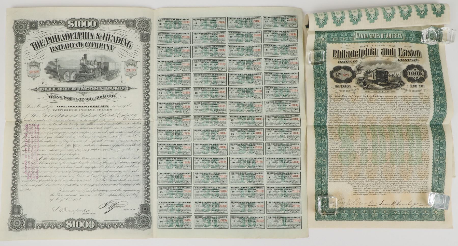 Lot of two: 1) Philadelphia & Reading Deferred Income $1000 Bond; 1882; with coupons, railroad vignette. 2) Philadelphia and Easton Railway Company $1000 Gold Bond; 1904; signed President Rothesburger.