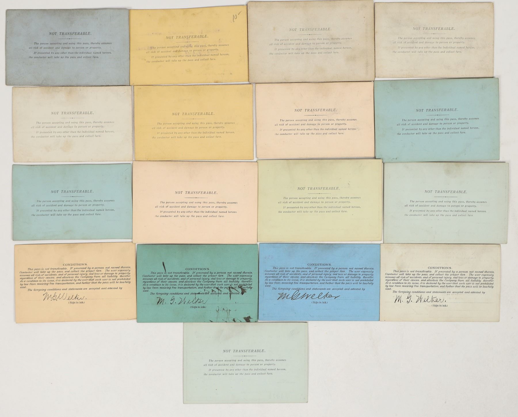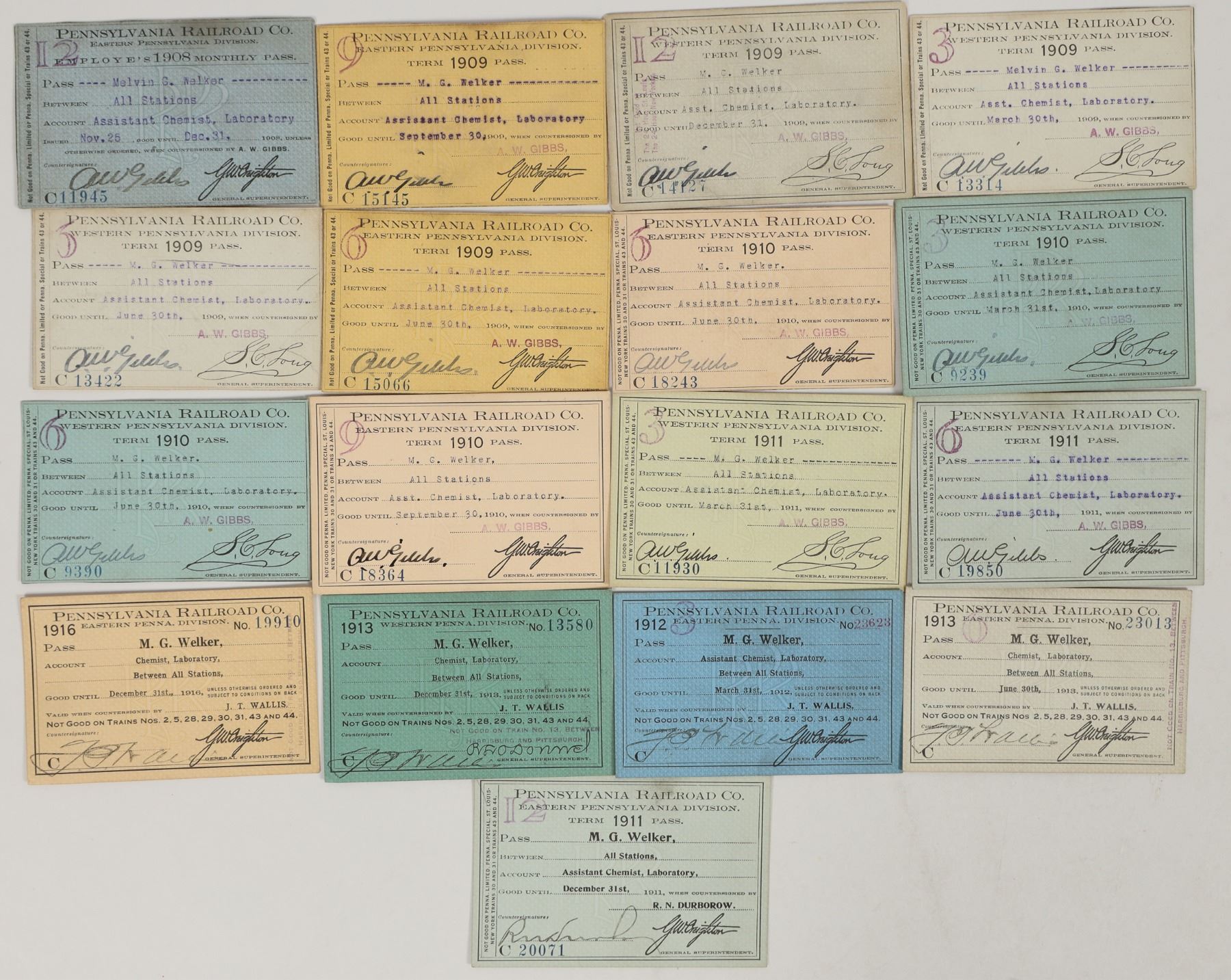 Lot of 14. Pennsylvania Railroad Co. Passes. 1908-16. All issued to Melvin G. Welker , Chemist -Laboratory. In very good cond. Internet search revealed no info on Mr. Welker