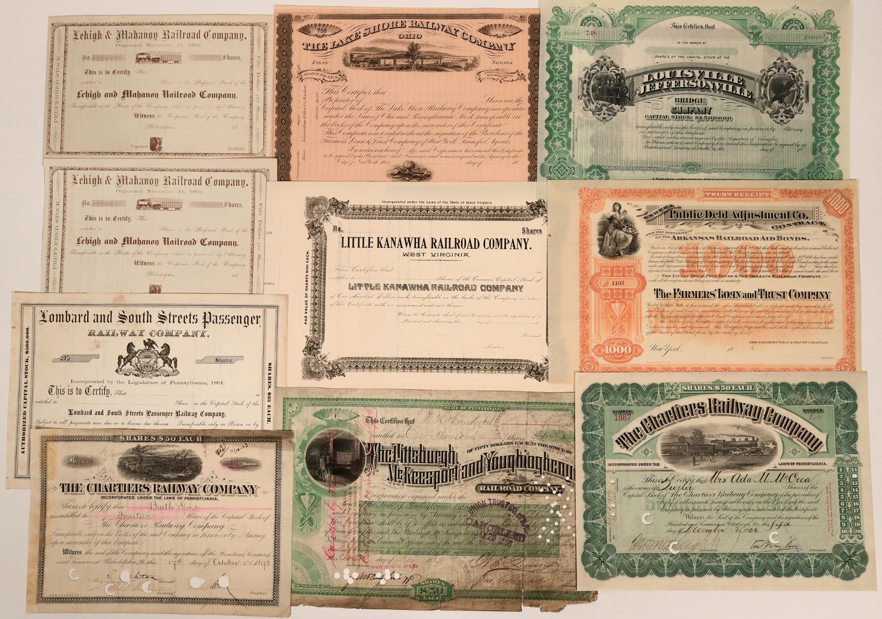 1. Pittsburgh McKeesport and Youghiogheny RR Co.- Cancelled 1,000 shares of McKeesport and Younghiogheny Rail Road Co, cert. #1 issued to W.H. Vanderbilt, oldest son of Commodore Cornelius Vanderbilt, businessman and philanthropist. Two raised company seals. 2. Seven Unissued/Uncanceled stocks. 1. Arkansas Railroad Aid Bond, orange, for The Little Rock, Pine Bluff & New Orleans Railroad Co. #1103, $1000 Trust Receipt (orange underprint, dateline 18__, vignette top left allegorical female sitting w/basket of flowers. American Bank Note Co. printer. EF 2. The Lake Shore Railway Co., #856, dateline 18__, black/red underprint, vignette 4-4-0 w/cars r-l. American Bank Note Co. printer. 3. Two Lehigh & Mahanon Railroad Co., brown, not numbered, dateline 18__, vignette 4-4-0 r-l , small bear at bottom. 4. Little Kanawha Railroad Co, not numbered, dateline 189_, black, no vignette, receipt attached, printer unidentified. 5 Lombard and South Streets Passenger Railway Co., not numbered, dateline 18__black. Vignette bottom horse drawn trolley, top state seal.Edward Stern & Co. printer. 6. Louisville and Jeffersonville Bridge Co., #748, dateline 19__, green, vignette left 4-4-0 r-l eagle w/wings spread. New York Bank Note Co printer. 3. Chartiers Railway Co Stock Certificates - Two certificates issued and cancelled. Cert. #1399, issued for 14 shares in 1895. Train in the distance behind a mill. Large hole cancels. Black area along top edge. Also, cert. #1887, issued in 1906 for 12 shares. Train runs left to right with people beside the tracks. Black on creme. Green. Shares were $50 Each.