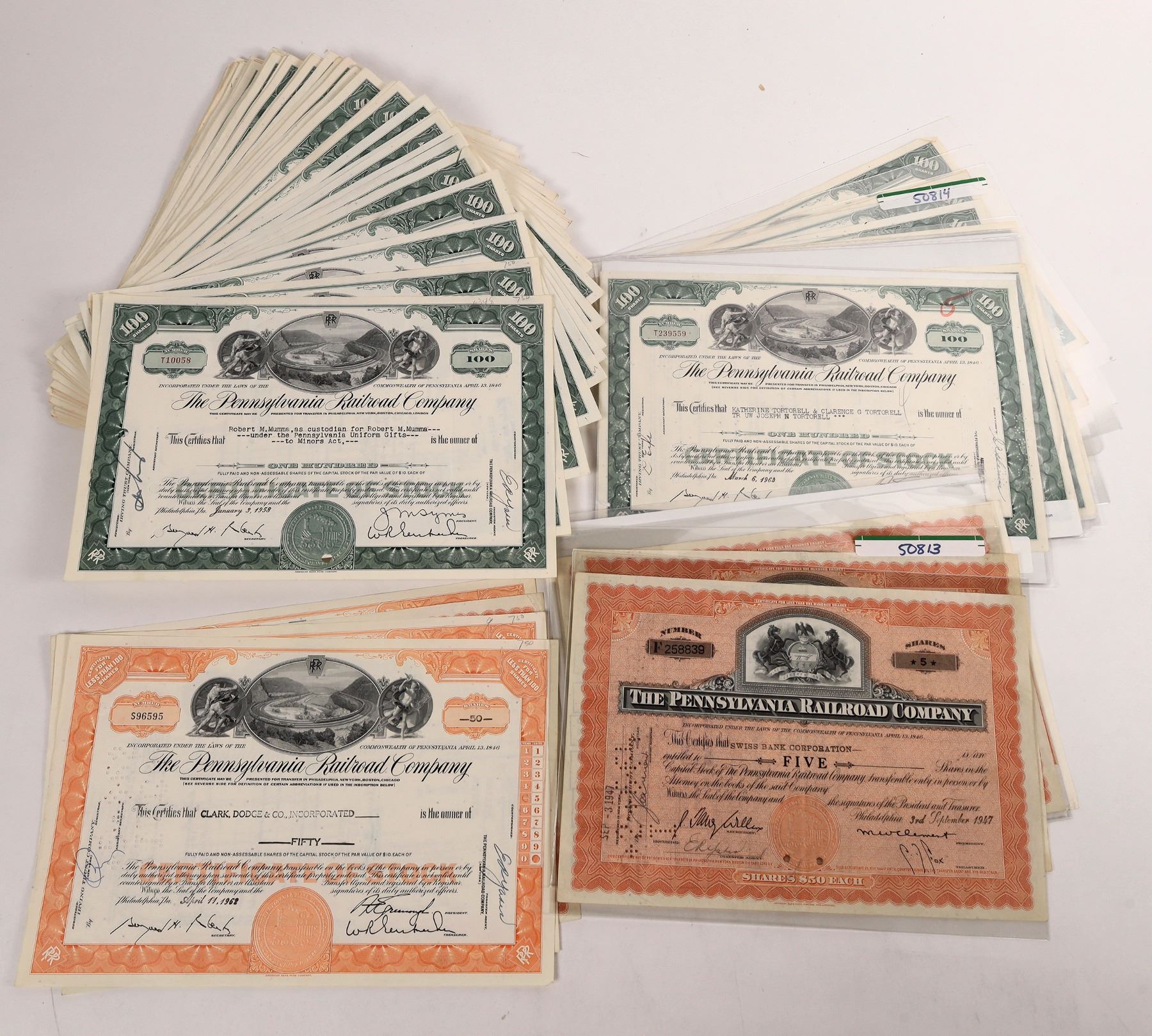 Lot of close to 100 issued stocks certificates, 1940s-1960s. Four different designs. Majority have a vignette of two trains passing on a curving track. Inc. in 1846. Headquartered in Philadelphia. By 1882, Pennsylvania Railroad had become the largest railroad (by traffic and revenue), the largest transportation enterprise, and the largest corporation in the world. Its budget was second only to the U.S. government. It acquired, merged with, or owned part of at least 800 other rail lines and companies. At the end of 1926, it operated over 11,000 miles of track. Pennsylvania Philadelphia