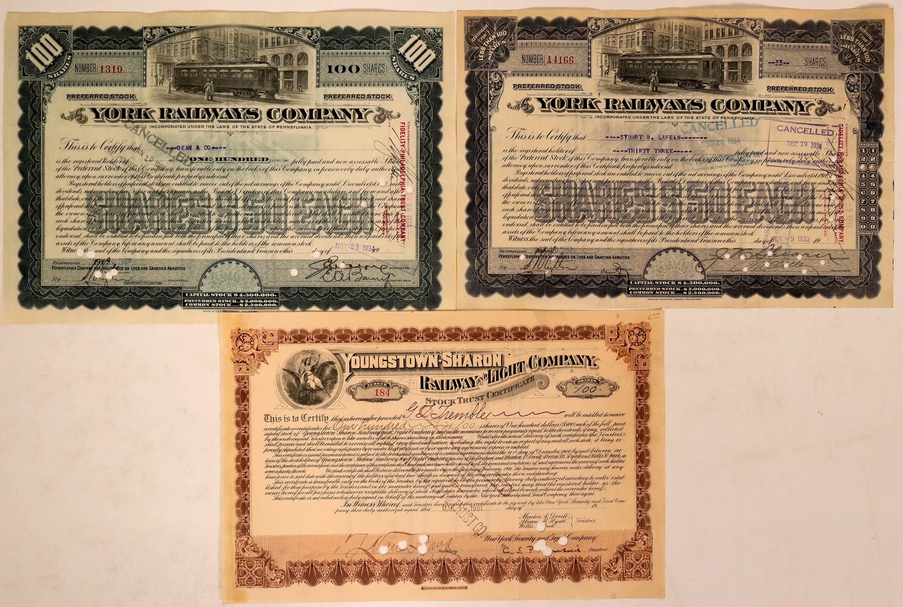 3 certificates. 1. Youngstown-Sharon Railway and Light Co. incorp 1900. #184, I/C, 100 shares @ $100 par issued March 1, 1901. Brown, vignette top bare breasted female holding lightening bolts. Western bank Note Co. VF 2. York Railways Co. incorp. 1907. when the majority of roads were dirt and the horse was the main form of transportation. Closed cars and smooth rails offered year-round comfort for local transportation. At its peak in 1923, York Railways Company streetcars carried almost 11 million passengers. They operated 68 cars operating over 85 miles of tracks. #A4166, I/C, 33 shares issued Oct 9, 1933, Purple, embossed seal, vignette electric streetcar. SHARES $50 EACH purple underprint, 8 revenue stamps on reverse. American Bank Note CO. #1310, I/C, Blue, 100 shares. issued Nov 23, 1934. VF