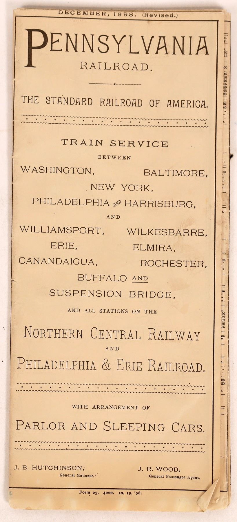 Pennsylvania Railroad time table. Service between Washington, Baltimore, New York, Erie etc. Some toning. Pennsylvania c. 1898