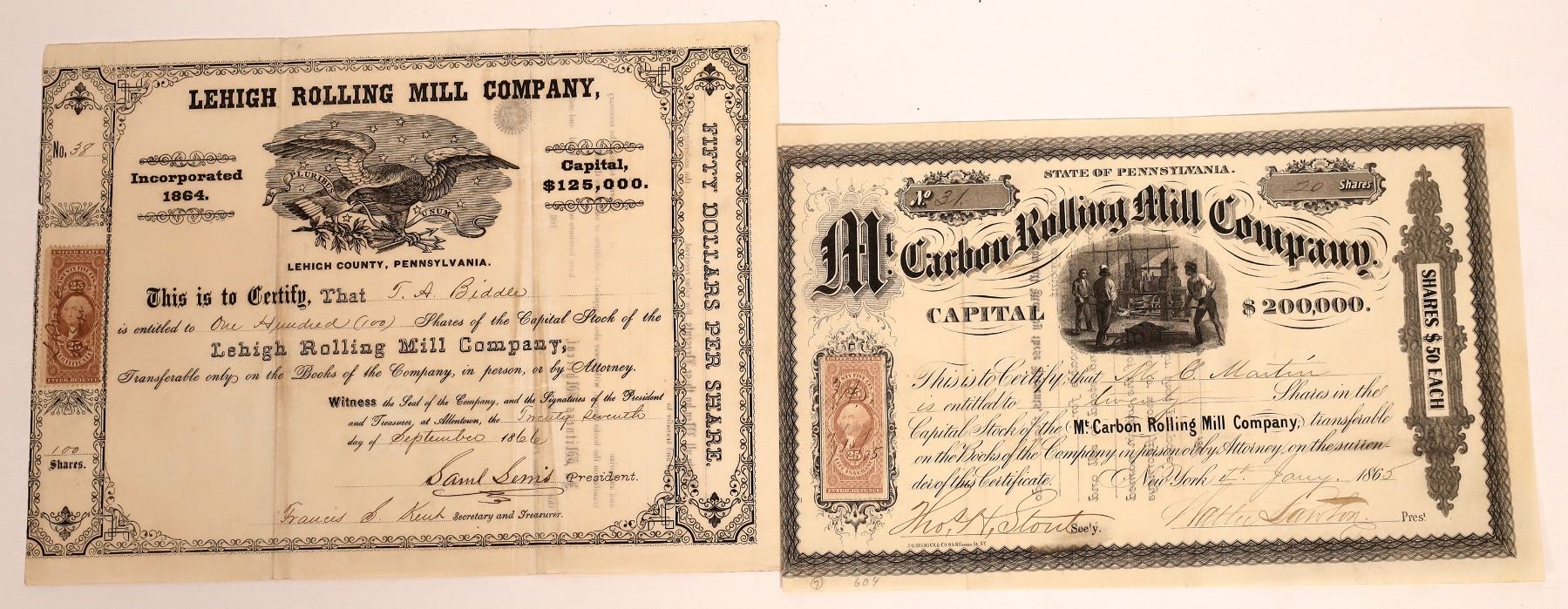 Lot of 2 includes: Lehigh Rolling Mill Company, Lehigh County, Pennsylvania. Issued in 1866 for 100 shares. Eagle and flag vignette. Also, Mt. Carbon Rolling Mill Company. Issued in 1865 for 20 shares. Factory scene vignette. Both uncanceled. State:Pennsylvania City: Date:1860s Provenance:
