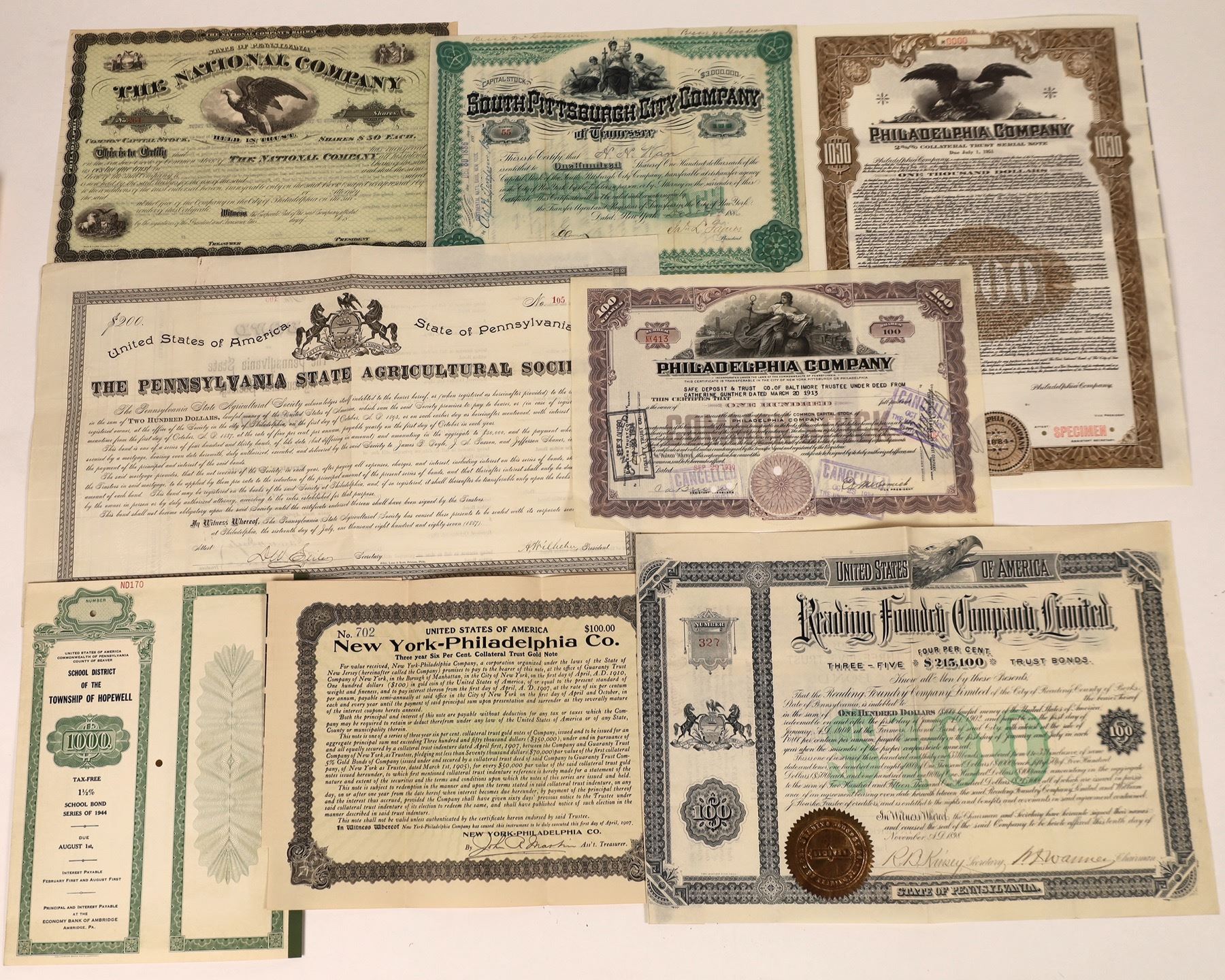 A group of eight stock certificates from the Commonwealth of Pennsylvania. Issuers include The National Company ( 1800's Unissued), Township of Hopewell School District (1944 Unissued), The Pennsylvania State Agricultural Society (1887), The philadelphia Company (1913), The Philadelphia Company (Specimen) New York-Philadelphia Company (1907), Reading Foundry Company Limited (1898) and South Pittsburgh City Company (1886). Please see photos for more detail and condition.