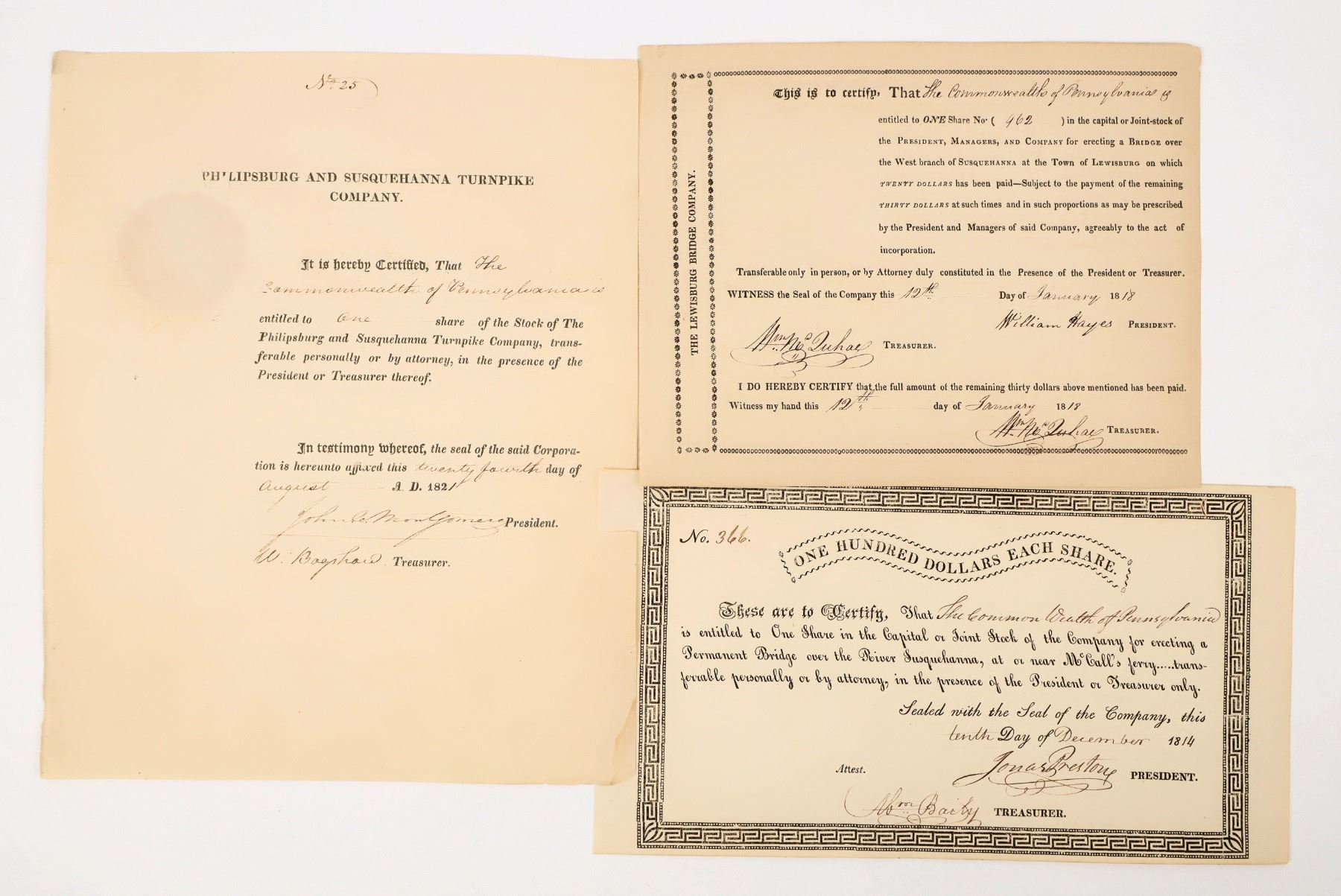 Lot of 3. Issued 1814-21. Shares for building a bridge over the Susquehanna River. One certificate has a sunburst embossed seal. VG or better.