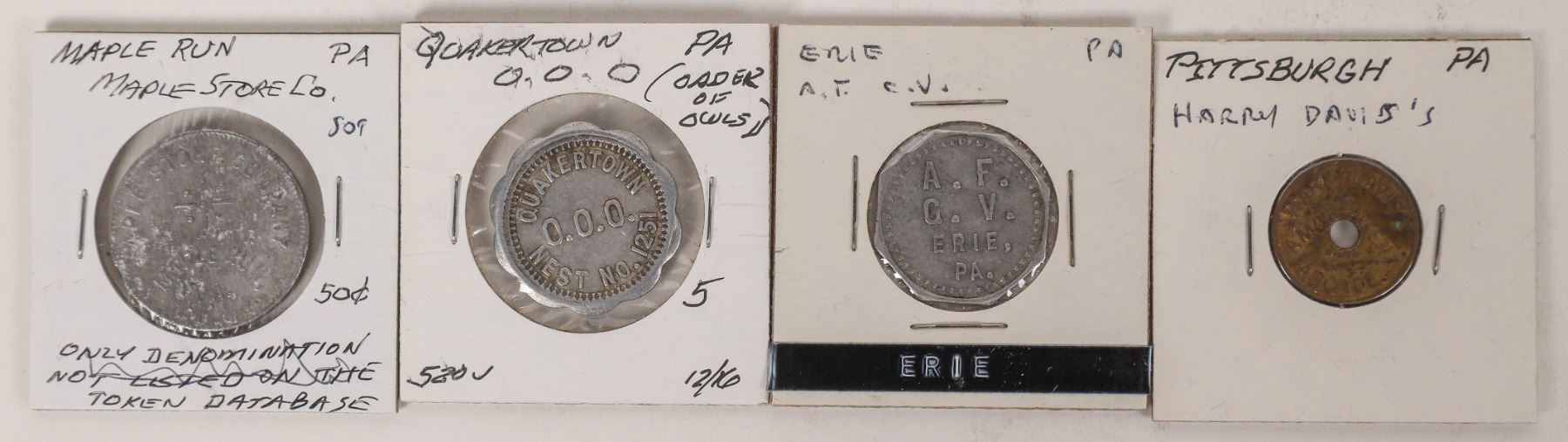 Four Pennsylvania tokens: Maple Store Company, Maple Run; Harry Davis Amusement Arcade, Pittsburgh; O. O. O. (Order of Owls), Quakertown; A. F. C. V. , Erie. Pennsylvania
