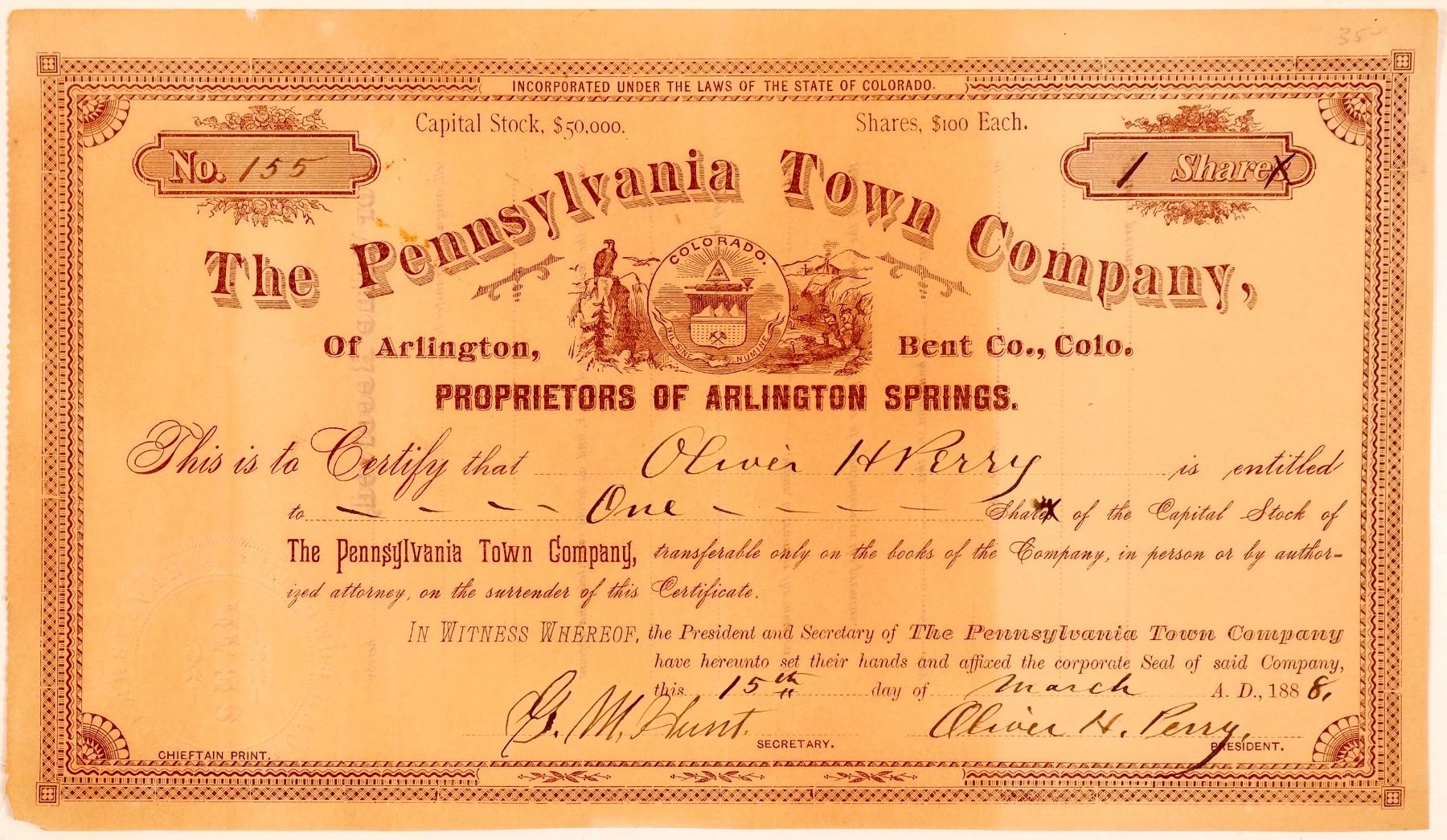 Proprietors at Arlington Springs, Bent County, Colorado. Inc. in Colorado. No. 155, issued for 1 share to Oliver H. Perry, president of the company, on March 15th, 1888. Not cancelled. Also signed by the secretary (Hunt). Maroon border and print. Colorado state seal vignette. Printed by Chieftain Print. 6" x 10" Small tear on bottom edge. Light toning.