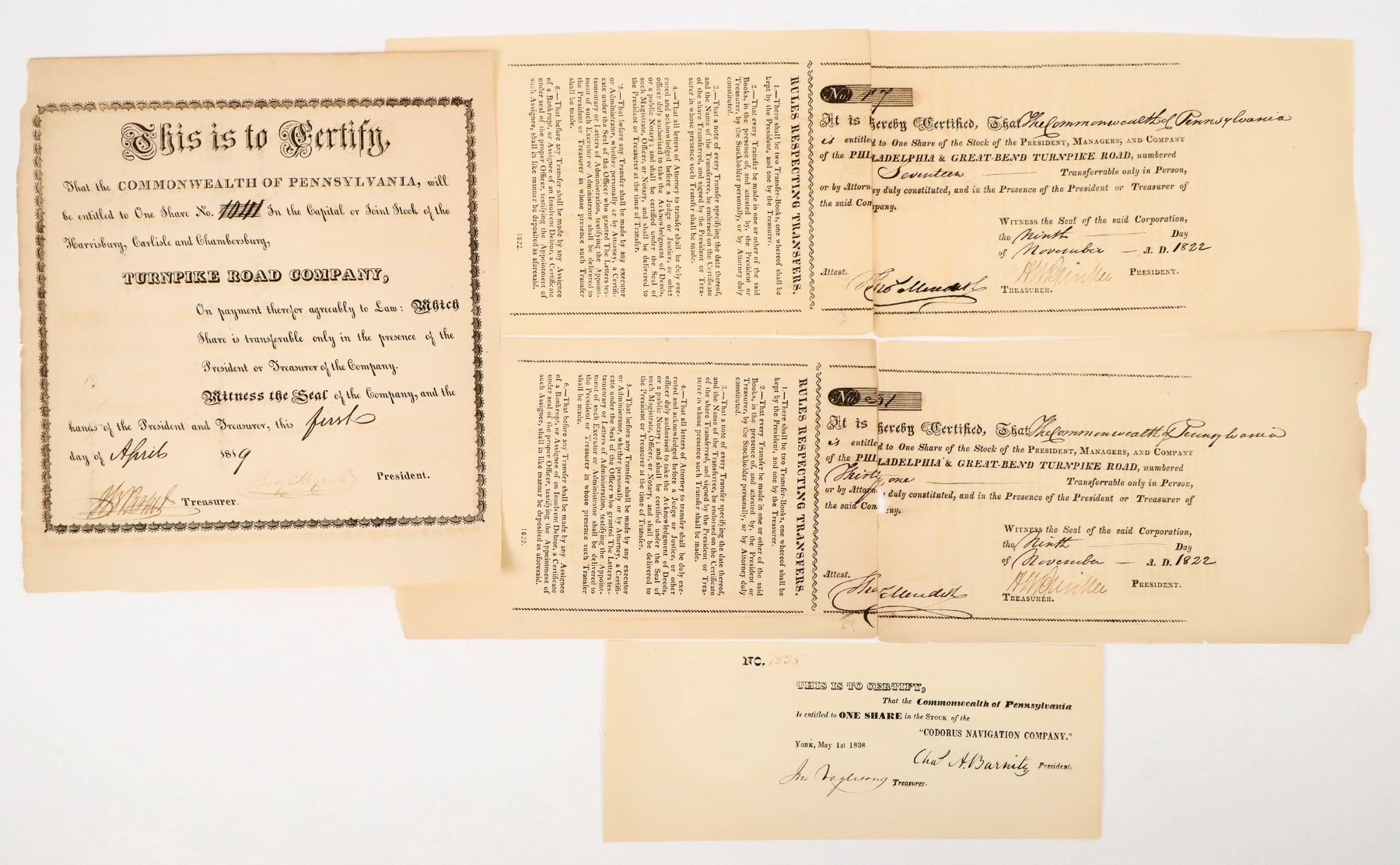 Lot of 4. I/U. Two certificates for Philadelphia and Great-Bend Turnpike road issue 1922 are separated at the bi-fold. Also certificate issued 1819 Harrisburg, Carlisle and Chambersburg Turnpike Road Co. and Codorus Navigation Co. issued 1838.