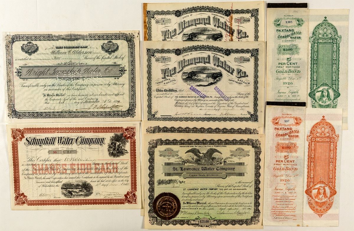 Lot of nine. Stocks: The Diamond Water Company (Hazelton, three issued 1896-1897, all cancelled, nice vignette of waterfall), St. Lawrence Water Company (two issued 1924, not cancelled, gold seal and eagle vignette), Schuylkill Water Company (1889, not cancelled, two vignettes), and Wright Township Water Co. (1899, punch cancelled, no vignette). Bonds: $100 and $500 bonds for Paxtang Consolidated Water Company. Both issued 1906. Not cancelled. Each has 24 coupons attached. Green or orange border. (Prag Collection) City: State: Pennsylvania Date: 1889-1924 hwac# 34369