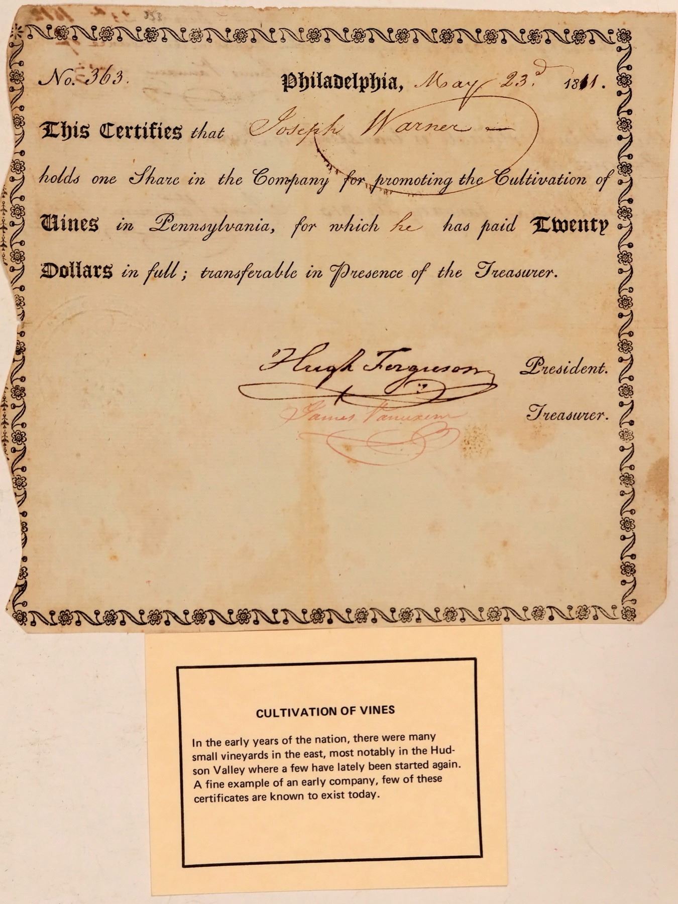 Wow! Very early wine stock certificate! No. 363, issued for one share to Joseph Warner on May 23rd, 1811, in Philadelphia for "promoting the Cultivation of Wines in Pennsylvania." Signed by president Hugh Ferguson and the treasurer (illegible). Not cancelled. Notations on reverse. 6.75 x 7.5 inches. Age discoloration. According to "Pennsylvania Wine: A History" by Cattell & McKee, these stocks were issued by the Pennsylvania Vine Company by Frenchman Pierre Legaux to raise money after an 1793 act passed by the Pennsylvania legislature. His vineyard was on 206 acres on land located 13 miles north of Philadelphia at Spring Mill. Philadelphia Pennsylvania