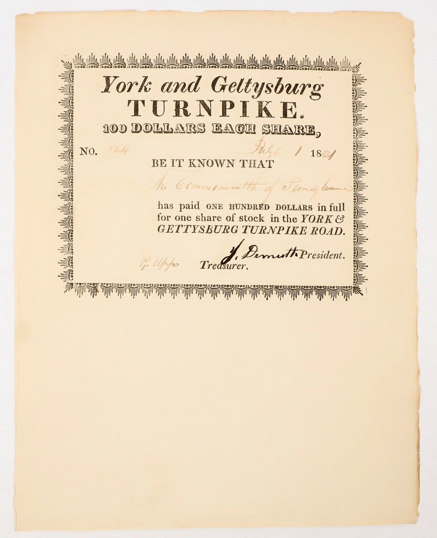 Pennsylvania York and Gettysburg Turnpike Stock, issued 1821. $100 par for one share. Embossed seal. EF