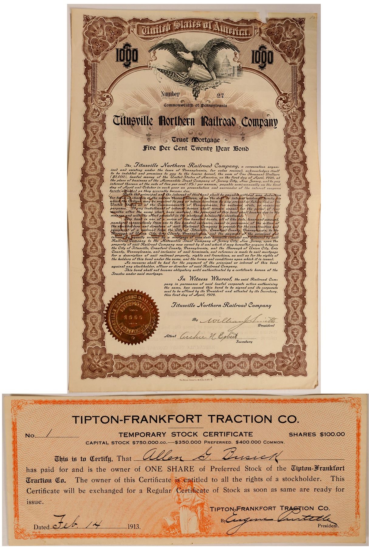 2 certificates. 1. Titusville Northern Railroad Co. incorp. Pennsylvania 1909. #27 of 500, I/U, $1000, 5%, First Mortgage 20 year issued April 1, 1909. Brown, gold embossed seal, vignette to eagle look r-l wings spread holding American flag and Union shield. $1000 brown underprint. The Brown-Green Co. printer. EF.