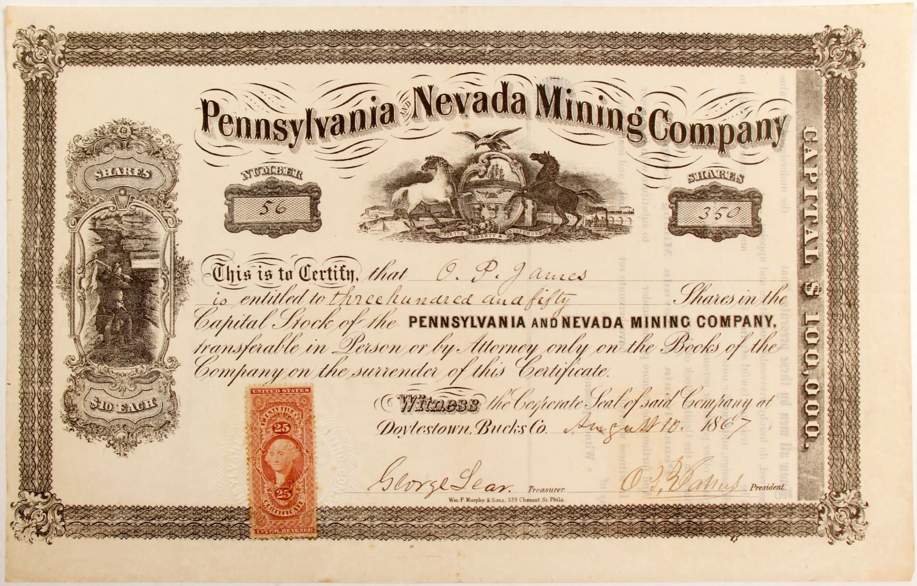 # 56 for 350 shares to OP James. Signed by George Lear and OP James as president. Dateline Doylestown, Bucks Co. August 10, 1867. Vignette of underground mining and one of two magnificent stallions and an eagle. These are the same certificate design, same state of origin, same names and the same date as the Quinterro stock also offered in this sale. This is our only lead to where this company was located? Dog ear upper right. Very small staining at center fold. 25c Certificate Revenue stamp. Not cancelled. State: Nevada City: Belmont? Date: 1867 HWAC# 85202