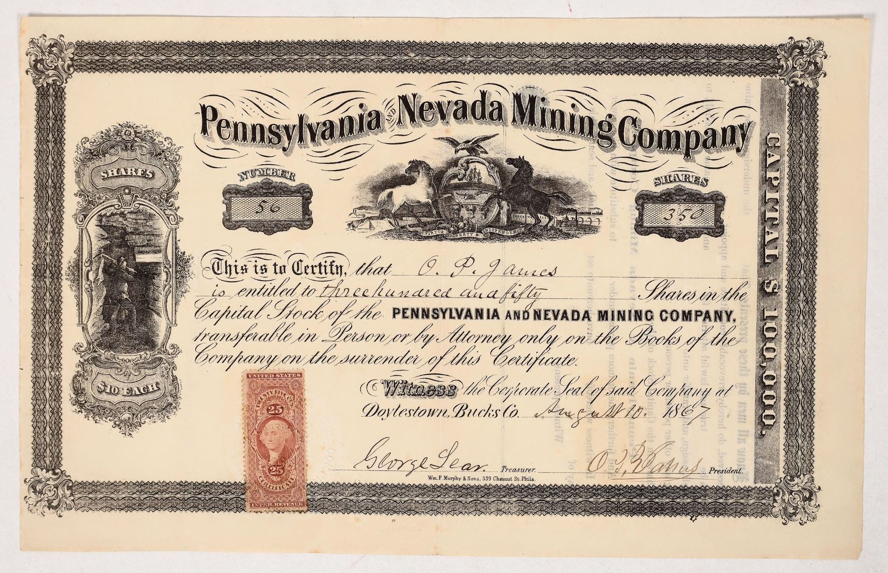 1867 Pennsylvania and Nevada Mining stock. # 56 for 350 shares to OP James. Signed by George Lear and OP James as president. Dateline Doylestown, Bucks Co. August 10, 1867. Vignette of underground mining and another of two magnificent stallions and an eagle. These are the same certificate design, same state of origin, same names and the same date as the Quinterro stock. Dog ear upper right. Very small staining at center fold. 25c Certificate Revenue stamp. Not cancelled. We could find no information on this company. However, investing in Nevada by Eastern firms either meant Lander County or Humboldt County. There was a Pennsylvania District in Lincoln County, but it wasn't discovered until 1867 and no activity took place there until 1871. [History of Nevada by Thompson and West and Mining Districts of Nevada by Tingley]