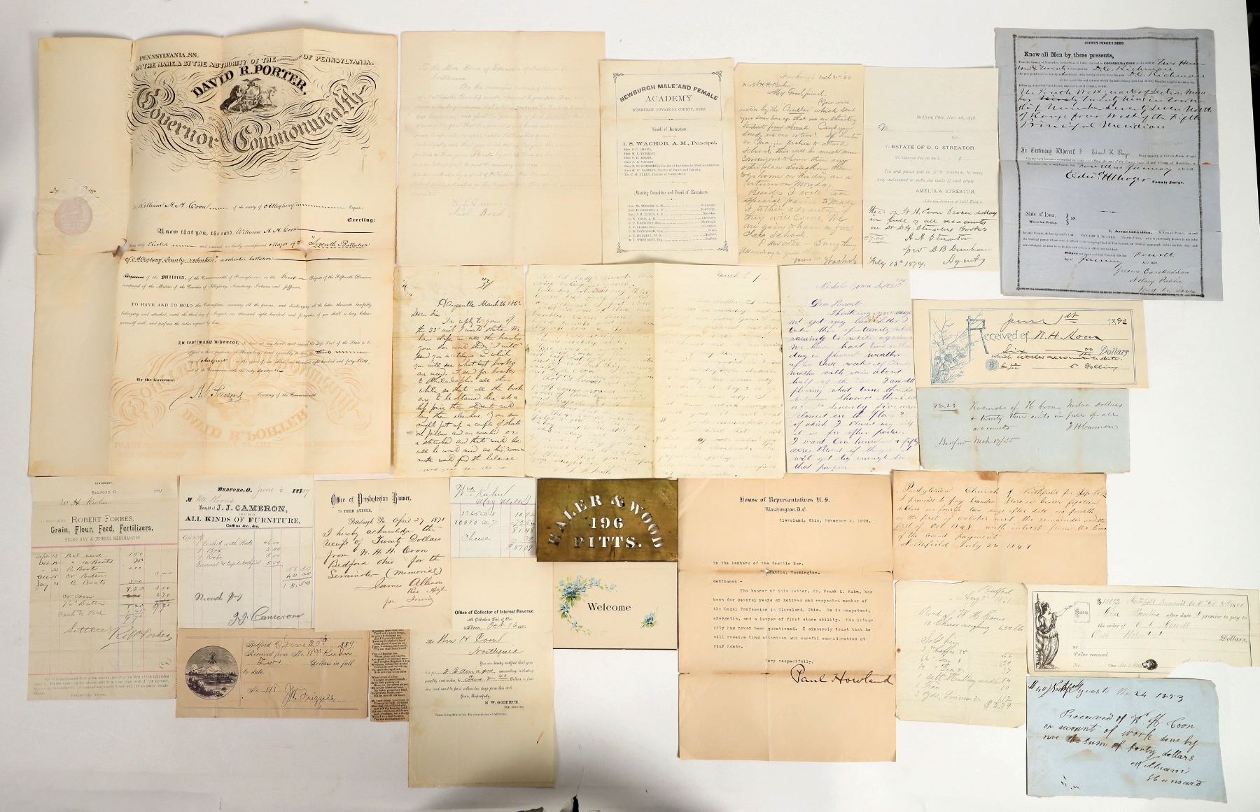 Pennsylvania (mostly) Ephemera-Political/Legal/Personal c1850-1900. This group appears to be related to the Kuhn (Coon) Family of Pennsylvania/Ohio, with a rich history, well documented by genealogists with strong ties to the Revolutionary War and politics in early American History. Group includes letters, receipts, Political letterhead, estate documents, a brass plate from Kaler & Wood, a Merchants Union Express Company receipts from 1868, covers, land leases and property documents, Wester Reserve Protective Tarif League certificate (1888)Medina County Bohemian Oat Association Bond receipt, and a certificate from David R. Porter, in the Name and Authority of the Commonwealth of Pennsylvania naming William Coon as Major of the "Seventh Battalion of the Allegheny County Volunteers. Many other early documents with dozens of signatures. George Beatty, Pitts, Rob Forbes, and many others hidden within.