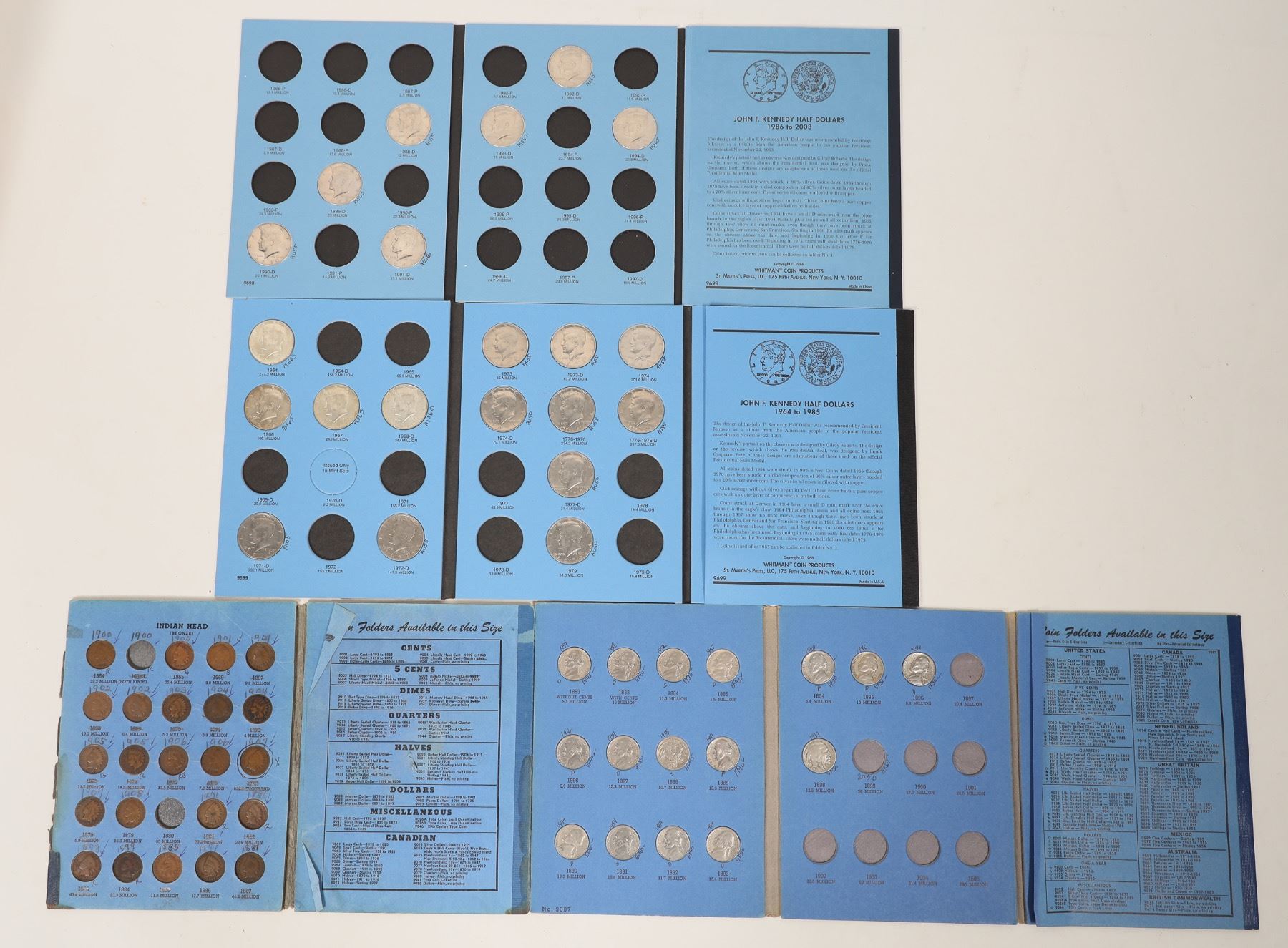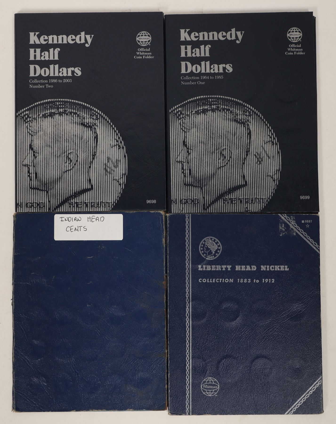 Four blue Whitman coin albums with coins in them: 1) #9003 Indian Head Cent Collection; cover and first page missing; remaining two pages have 40 Indian Head cents with the album date crossed out and the coins date; coins are well circulated, G-F condition. 2) #9007 Liberty Head nickels; with no Liberty Head nickels, but two Buffalo nickels and 20 Jefferson nickels, all prior to 1960. 3) #9699 Kennedy Half Dollars 1964-1985; with 17 coins: one 90%; three 40% silver. 4) #9698 Kennedy Half Dollars 1986-2003 with eight coins.[