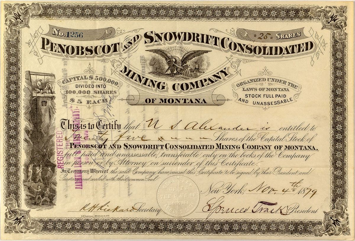 Stemple District, located 20 miles from Helena. No. 1256, issued for 25 shares to NS Alexander on Nov. 4th, 1879. Signed by Spencer Trask (president) and R.H. Rickard (secretary). Not cancelled. Very nice mining vignette showing ore buckets hoisted near miners working with headlamps. Also vignette of eagle. Printed by L.H. Lawrence, New York. 8" x 11.5" Folds, light toning. City: Stemple District State: Montana Date: 1879 ID: 36643