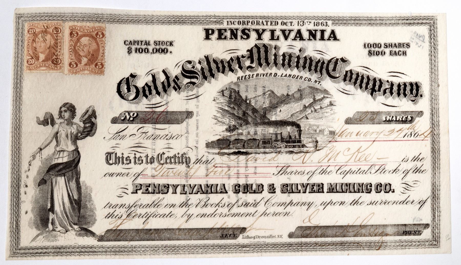 The best part of this certificate is the vignettes. A rare small 'Goddess of Gold' adorns the left. A steam locomotive pulling ore cars, or coal cars since this is a Pennsylvania related stock, is in the middle. # 26 for 25 shares to David R. McKee. Signed by Thompson Campbell Jr. and president Charles H. Ensign. Dateline San Francisco January 24, 1864. Incorporated October 13, 1863. Small 5c and 20c revenue stamps. Not cancelled. Drouaillet printer. Location: "Reese River D. Lander Co. NT."'Pensylvania' is not necessarily misspelled. It was an acceptable spelling through the Civil War. Just Google 'Pensylvania'. Top left corner ever so slightly rounded. Writing is faded, but readable. Otherwise no edge, corner pin hole or discoloration issues. Found no information on this mine.
