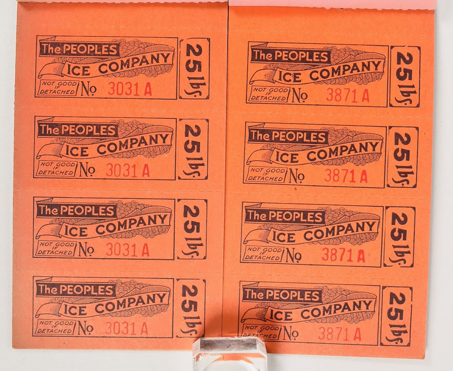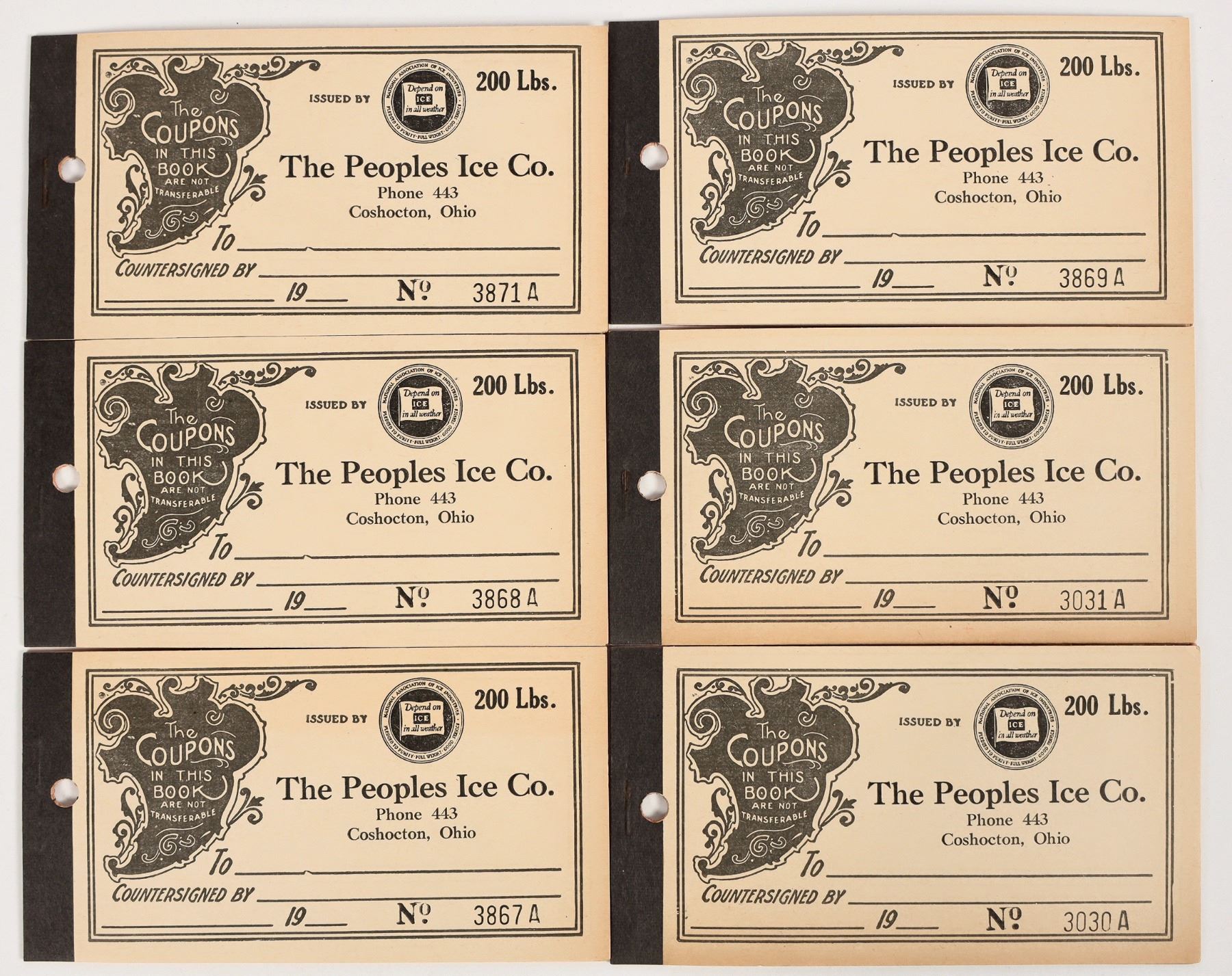 Printed by the Kansas Bank Note Co. of Fredonia, Kansas for The Peoples Ice Co. of Coshocton, Ohio. Six books good for 200 lbs. of ice delivery. Dated in the 1940s.