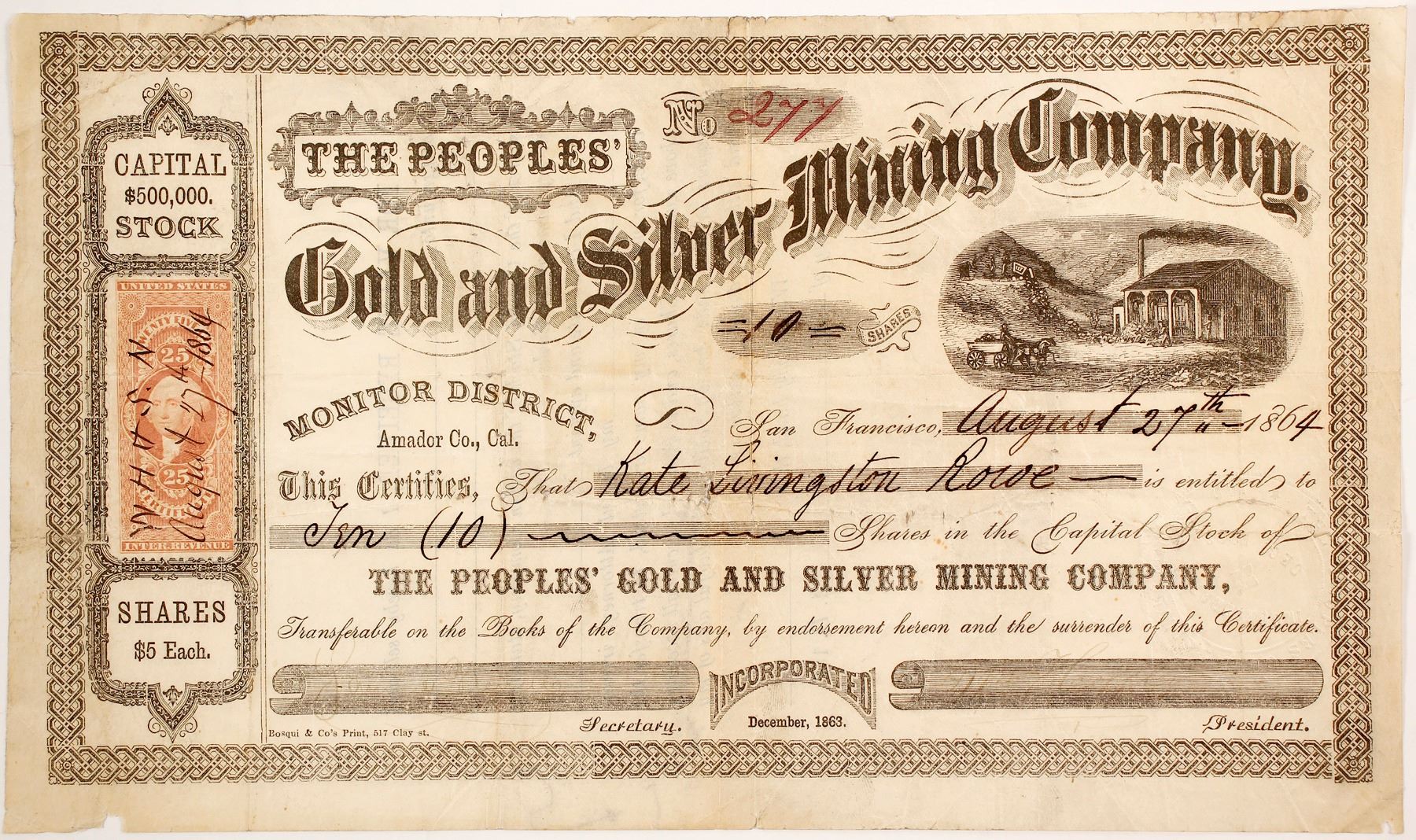 Incorporated December 31, 1863 and capitalized at $500,000; 100,000 shares at $5. Monitor Mining District, Alpine County. Early certificate No. 277 made out to Kate Livingston Rowe for ten shares dated August 27, 1864. Signatures have faded, but we believe they are secretary Samuel Newell and president William Heffley. Large mining buildings top right, 25 cent internal revenue stamp. Not cancelled. Black print. Bosqui print. Rips especially at fold edges. Tears on border. Light staining. Holes along print and folds. Good condition.