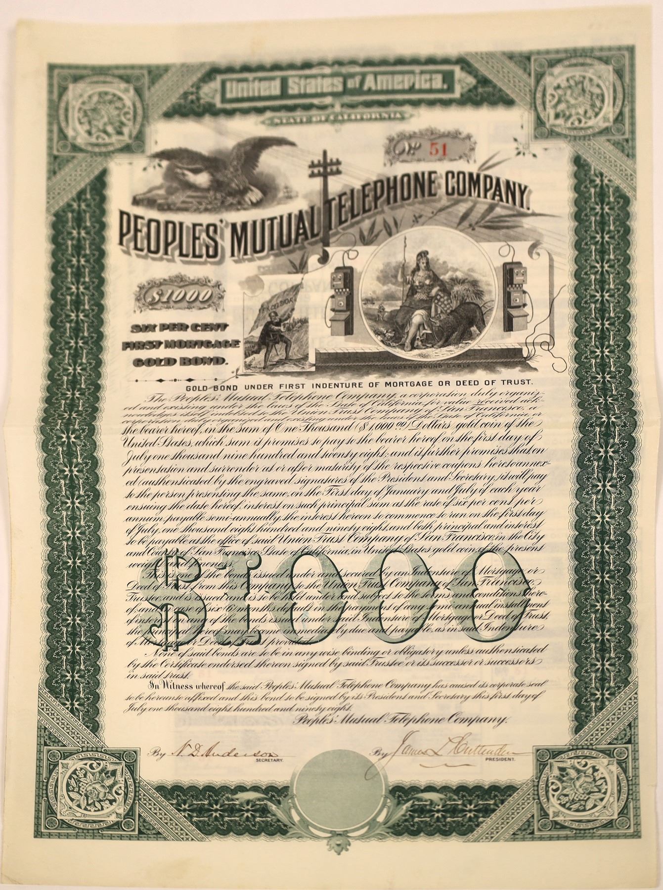Beautiful, $1,000 1st Mortgage Bond #51 from the People's Mutual Telephone Company. Inc. in California. Issued in 1898. Vignettes of two telephones, an underground cable, and a telephone pole with wires. Fifty-three coupons attached at the right. Nicely engraved, but no printer noted. Uncanceled. VF. State:California City: Date:1898 Provenance: