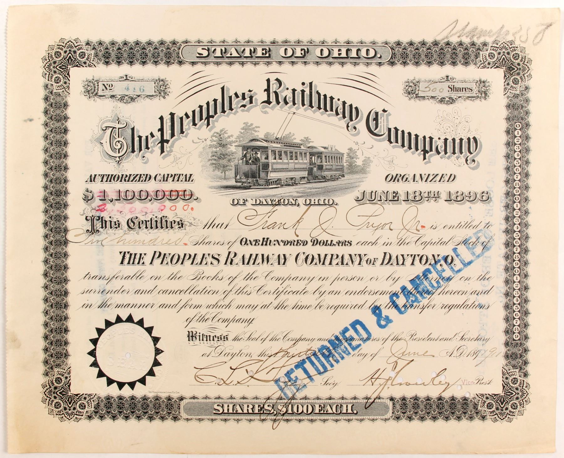 I/C #416 Frank Pryor 500 shares 1891 signed by President Crowley. Streetcar vignette. Prag Collection. State: City: Date: 1891 HWAC# 84223