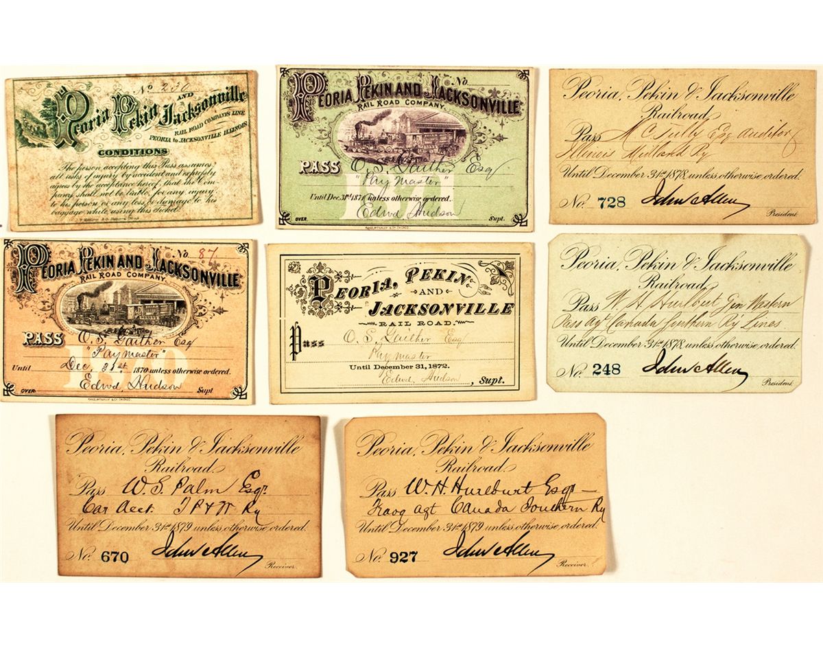 Eight early passes, two with fabulous vignettes. 1869, 1870 (great color pictorial!), 1871 (great color pictorial!), 1872, 1878 (2) and 1879 (2). Prag Collection