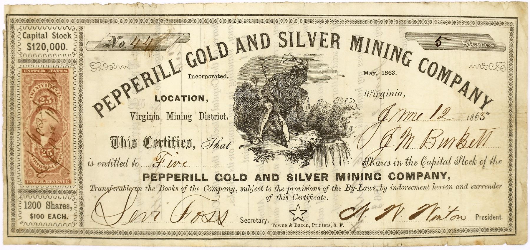 # 44 for 5 shares to J. M. Bell. Signed by Levi Ross and N. W. Winton as president. Dateline Virginia, June 12, 1863. Incorporated May 1863. 25c warehouse revenue stamp. Not cancelled. Location: Virginia Mining District. Native American vignette. Towne & Bacon printer. Edges are rough (tips, wrinkles, stains). Still overall in good condition. Nelson Winton was elected as the first president of Virginia City when it was incorporated in 1861 in the Utah Territory. NW Winton was the Storey County clerk at this time. He also served as Carson County Clerk. Historical Notes included. [History of Nevada by Thompson & West]