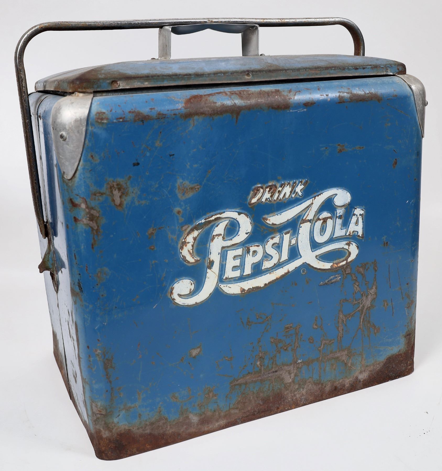 Blue with white Pepsi Cola metal cooler. Handle pivots to secure top. 18.75x19x13" Usage wear and rust.