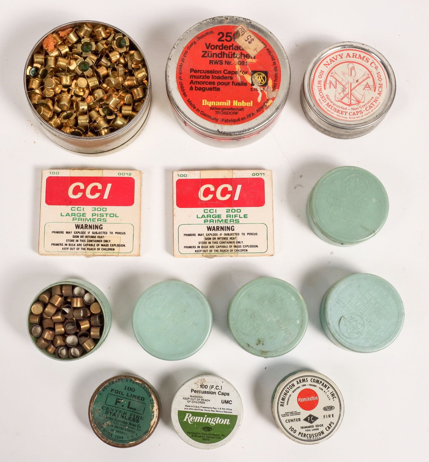 This cache of percussion caps will keep your vintage Sharps, and Springfield percussion rifles firing with vintage 1970's Navy Arms Co. 100 winged musket caps, 500 Vorderlader Zundhutchen (read the German) RWS #1081 Percussion caps for musket, 100 (original) Foil Lined F.L. center fire staynless Goldmark's Percussion caps unopened tin, over 400 CVA musket caps, 100 Remington Arms #9 percussion caps, 100 CCI large pistol primers, 100 CCI large rifle primers. Please see photos for details. No sales to New York, New Jersey, California, Hawaii. No international sales. Additional shipping fees apply. From the Sherman collection.