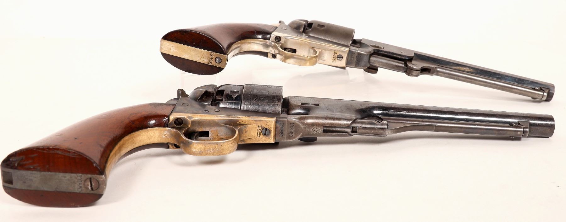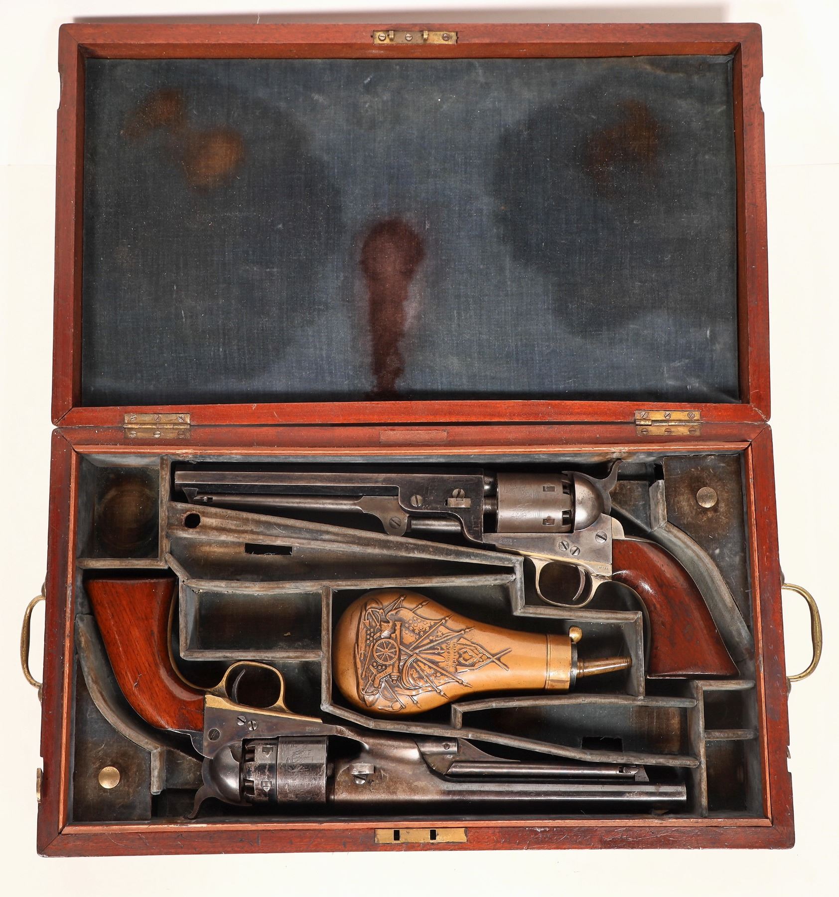 This cased set of percussion Colts holds an 1860 Army S/N 102550 (1863) cut for a shoulder stock on a three screw frame, and an 1851 Navy S/N 198261 (1866). The Army has numbers matching with the exception of the cylinder and wedge. The barrel has inspector's marks "GG" on the left and "H" (sub-inspector) on the right side. A double stamp may mean that the piece was inspected twice (ref. The Rampant Colt, Pate, 2018, p. 31). The letter "D" sub-inspector marks are visible on the shovel-head below the hammer and the bottom of the right grip. The barrel has been reblued and the bore is bright and fresh without pits. There are no visible cartouches on the grips. A cylinder scene is crisp. .44 CAL. is marked on the left side trigger bow flat. "COLTS/ PATENT" left frame. The trigger guard has a mustard patina. It is In-time working order. The Navy has original bluing with a plum colored patination worn grey at the corners; the bore is bright without pitting. All numbers matching including the wedge. There are no inspector's marks in the post war period (1866). About 60% silver plating is intact on the backstrap and trigger guard. The grips may have been re-varnished and show handling wear. A naval scene on the cylinder is light but still visible. .36 CAL. is marked on the left side trigger bow. The gun is in-time with a heavy main spring.
