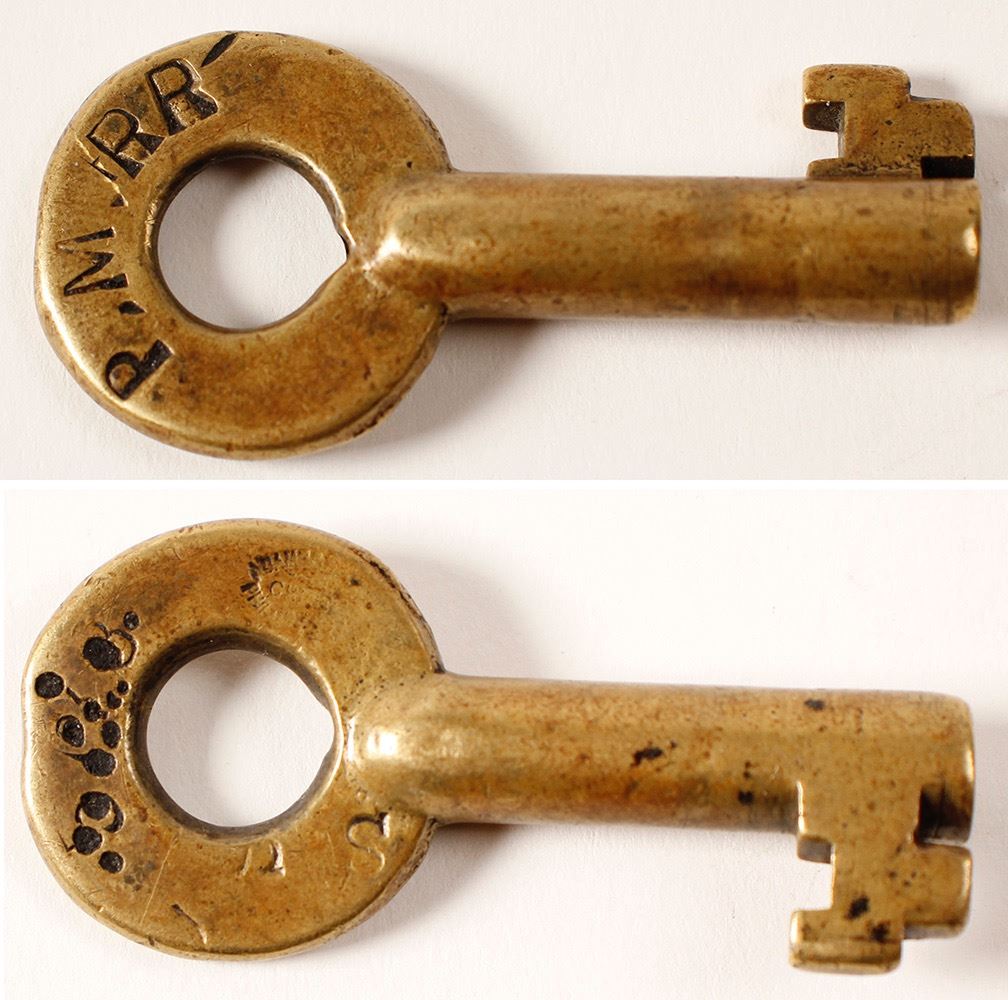 PM RR brass railroad switch key with manufacturerÕs stamp Adams & Westlake (oval marking). From carrier Pere Marquette Railroad in MI and IN that operated 1900-1917. Key dates from period 1905 to 1920. Date: Location: Illinois HWAC# 571909