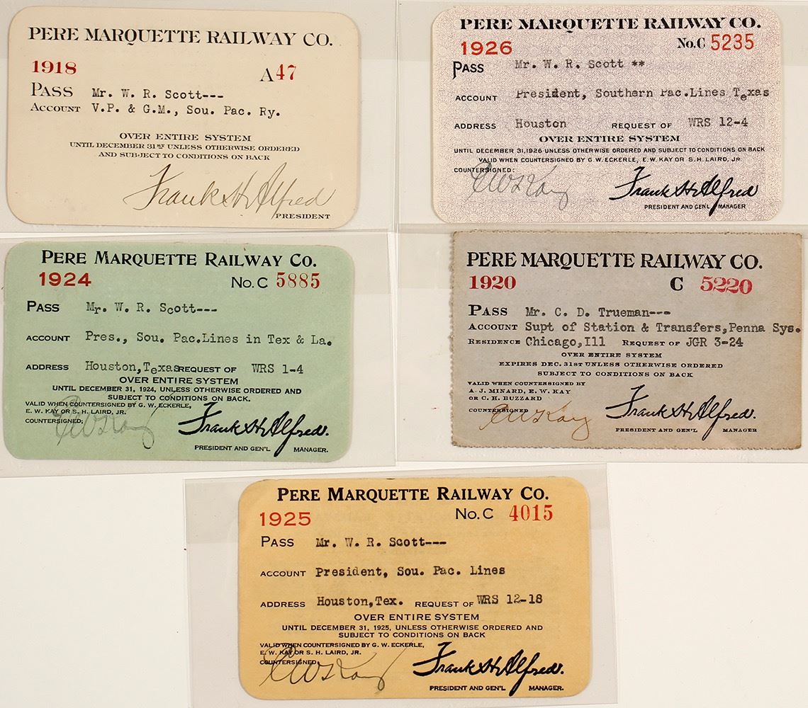 Lot of five different years. Issued 1918, 1920, 1924, 1925, and 1926. Four are issued to W.R. Scott, president of the Southern Pacific Lines (none signed by Scott), and one is issued to C.D. Trueman, Pennsylvania System (signed on back). The 1918 pass has the live signature of president Frank Alfred. The rest are preprinted. Operated from 1900-1947 in the Great Lakes region of the United States and southern parts of Ontario in Canada. Tracks in Michigan, Ohio, Indiana and the Canadian province of Ontario. Its primary connections included Buffalo; Toledo; and Chicago. (Potter Collection) Date: 1918-1926 Location: Michigan HWAC# 60352
