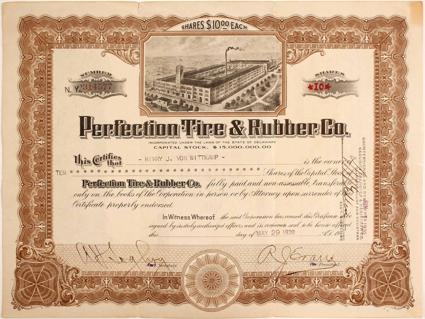 10 shares of Perfection Tire & Rubber Co cert #N.Y. 314577 issued to Henry J. Von Wittkamp on May 29, 1920. Signed R. J. Evans, VP. Countersigned and registered June 1, 1920. Brown border and company seal. Perfection Tire and Rubber Company was incorp. in 1917 in Delaware. Company had plants in Fort Madison, IA; Wabash, IN and, L.A., CA. Produced an asbestos-protected tire that claimed unusual durability and inexpensive mileage. Ken Prag Collection