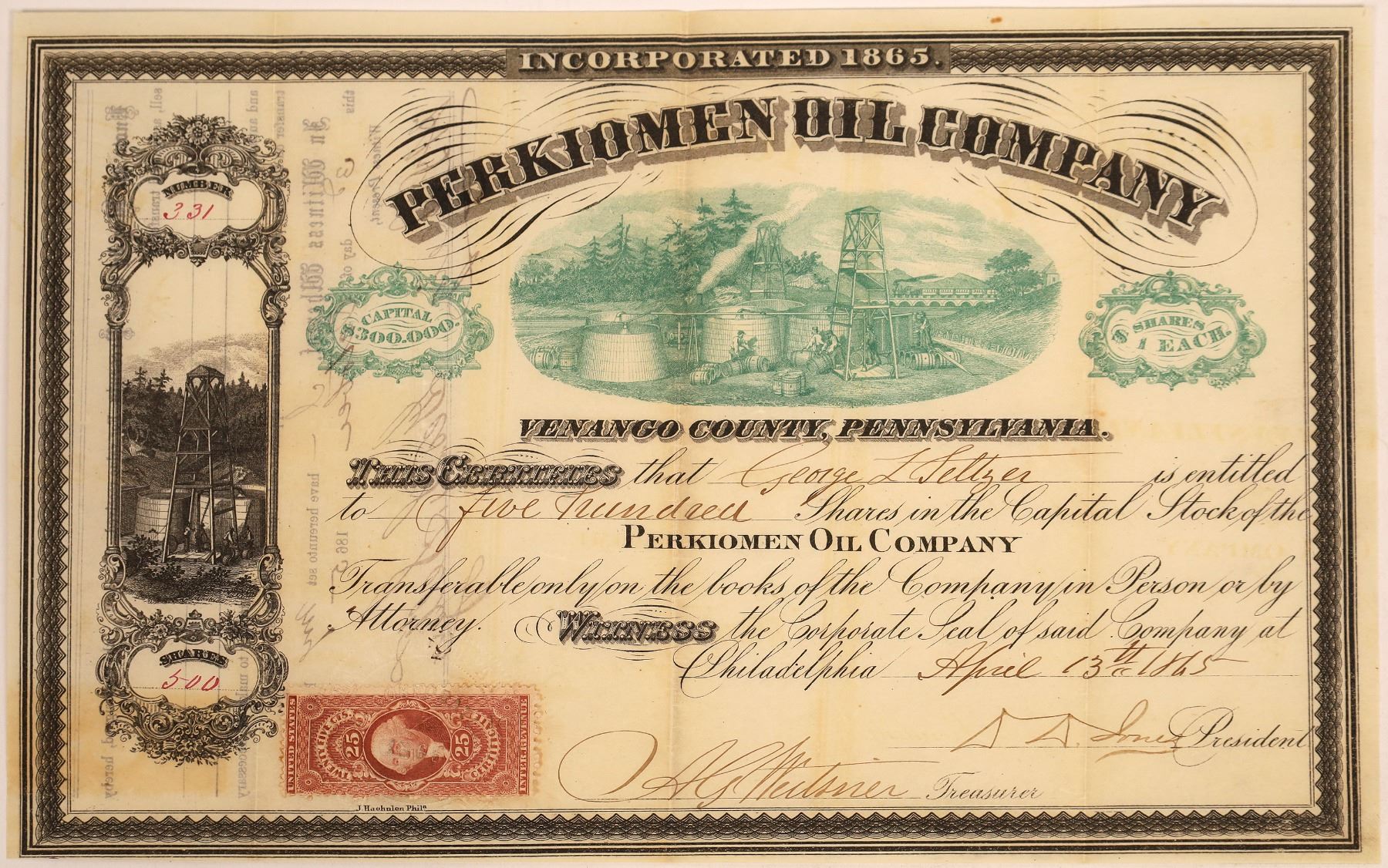 #331 for 500 shares to George Seltzer on April 13, 1865. Endorsed on back. Signed by president DA Jones and secretary Weilsner(?). 2-cent certificate revenue stamp. Tow vignettes. Oil rig on right and rare green oil field at top center! Haehulan, Philadelphia printer. Outside of folds and discoloration where the revenue stamp was, no edge, corner, discoloration or pin hole issues.