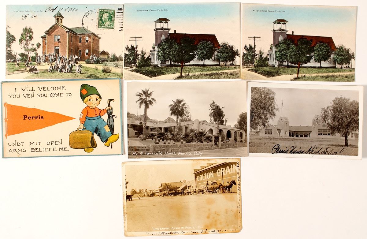 Lot of 7: "Unloading Grain" with horse drawn wagons; Perrisito Hotel; Perris Union High School; Congregational Church; Union High School, 1911. City: Perris State: California Date: ID# 44811