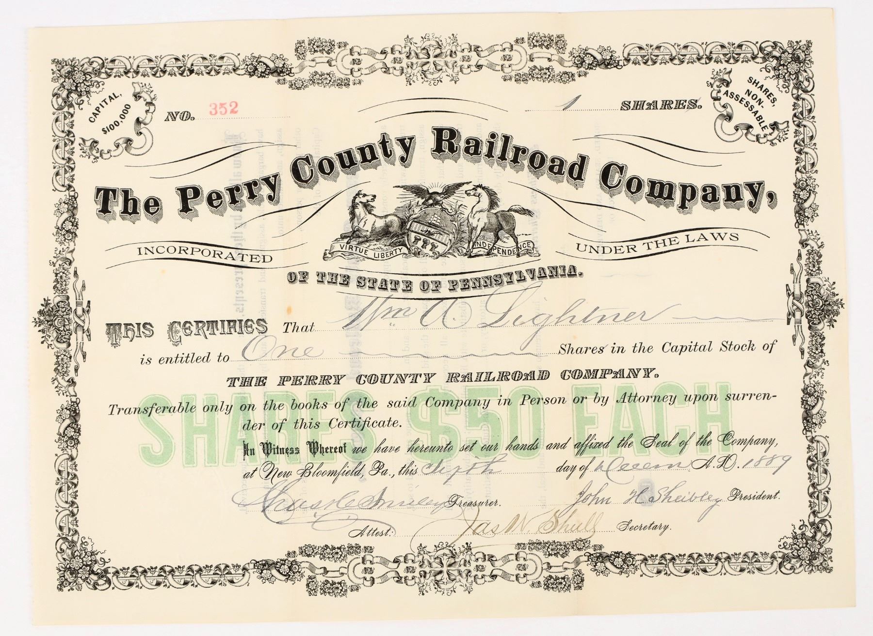 No. 352, issued for 1 share to William Lightner in 1889 in New Bloomfield, PA. Signed by president Sheibley, the treasurer, and the secretary. Not cancelled. Inc. in 1887. Ran from Duncannon to Bloomfield Junction, Pennsylvania, a distance of 13.817 miles. Taken over by Susquehanna River and Western Railroad Company.