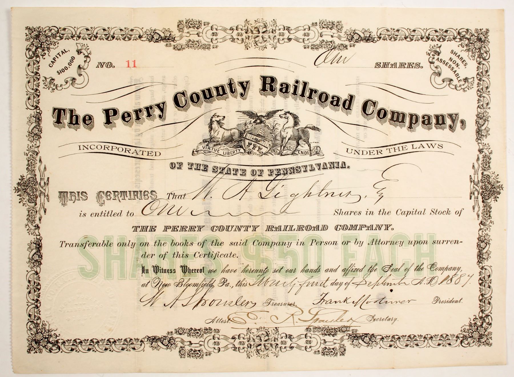 I/U #11 WA ? 1 share 1887 signed by President Mortimer. Prag Collection State: City: Date: 1887 HWAC# 84253