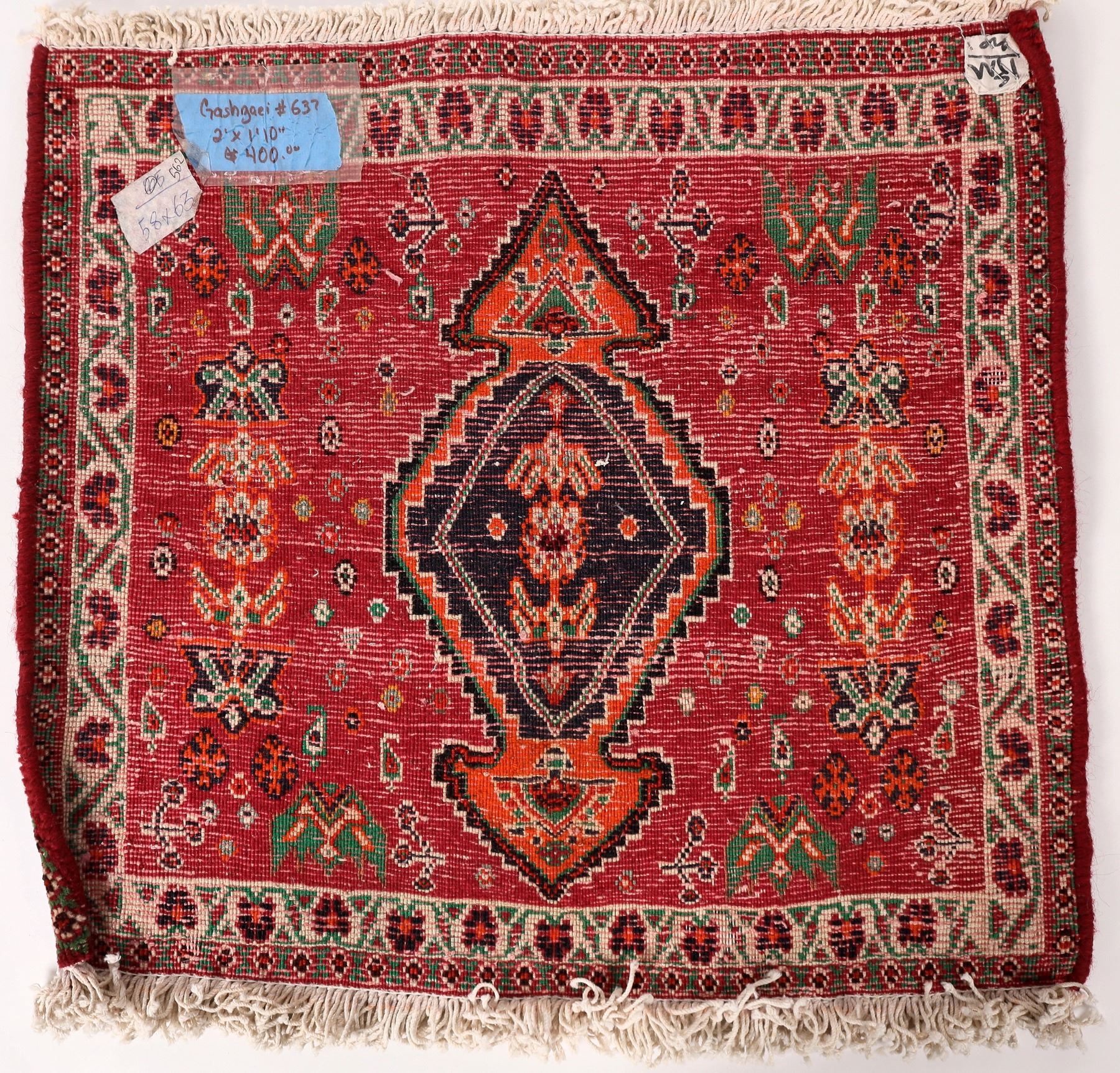 Desc Authentic rug crafted by the famed Qashgaei nomads in Iran. No tears, stains or visible damage. Dimensions:Approximately 2' X 2 '. Multi-colored with Red, Dark Blue, blended handsomely with lighter shades of Orange Iran